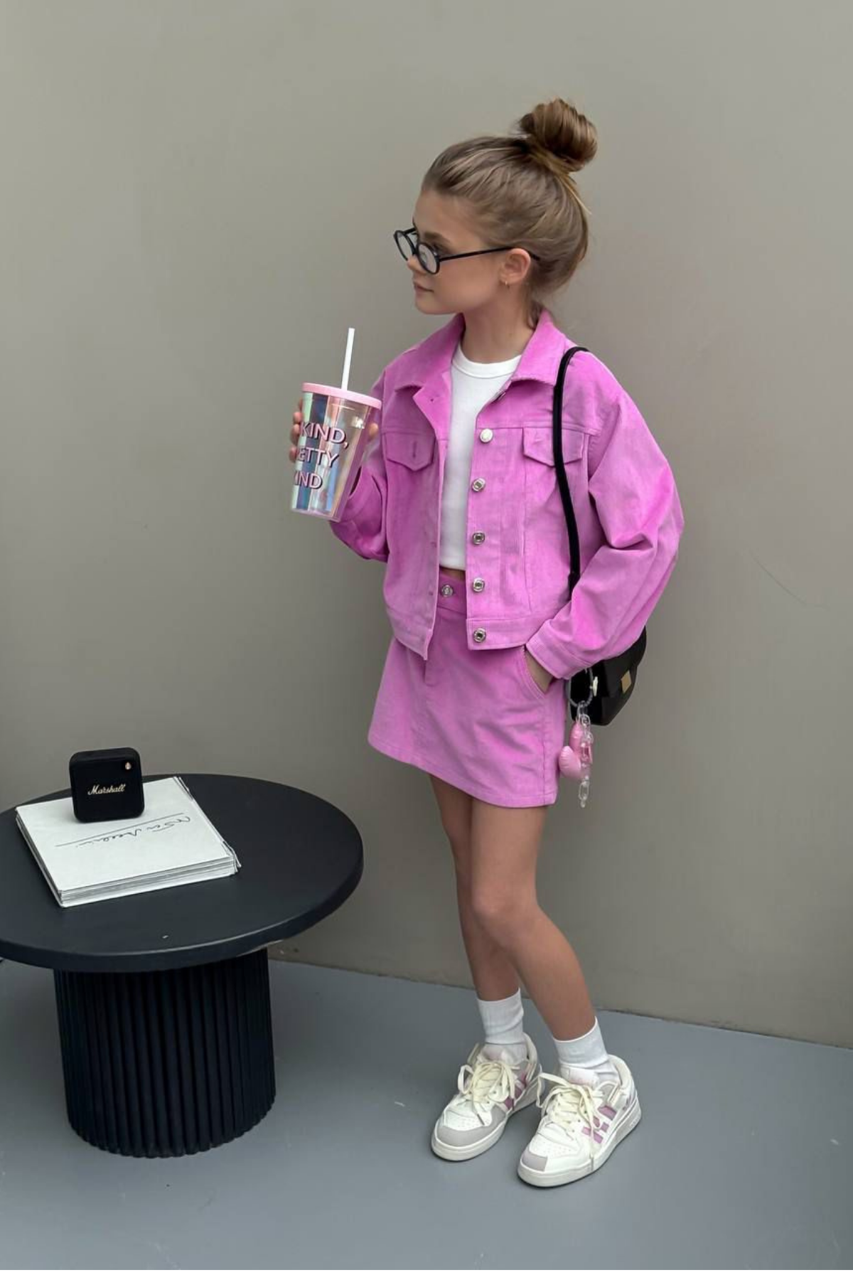 İki parçalı pamuklu takım. Uzun kollu düğmeli crop ceket ve mini etek modeli. Günlük kullanıma uygun, rahat kesim.
