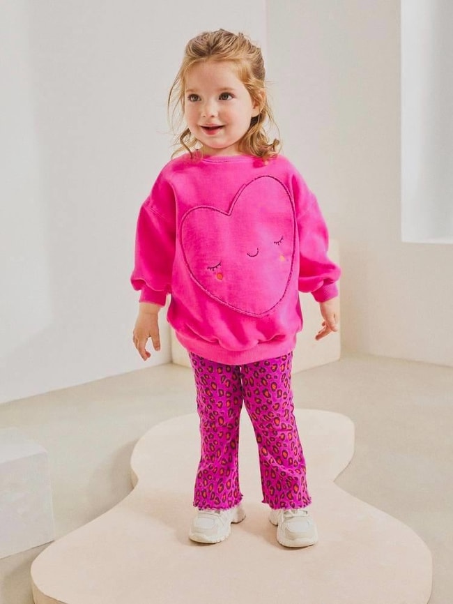 Sweatshirt, ön kısmındaki büyük kalp deseni ile şirin bir görünüm sağlarken, oversize formuyla rahat bir kullanım sunar. Pantolon ise canlı fuşya üzerine leopar desen baskısıyla modern ve eğlenceli bir tarz kazandırır. Esnek beli sayesinde kolay giyilip çıkarılabilir.