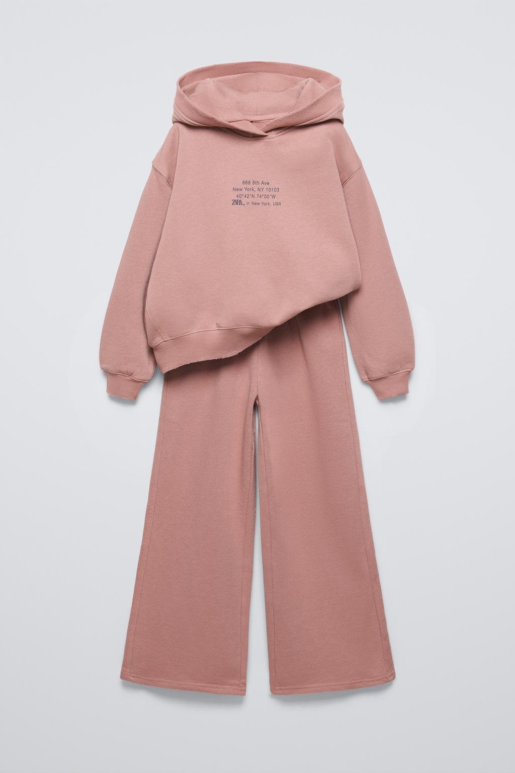 İki parçalı pamuklu eşofman takımı. Kapüşonlu, düşük omuzlu, ön baskı detaylı sweatshirt. Yumuşak dokulu, geniş paça rahat kesim eşofman altı ile kombinlenmiştir.