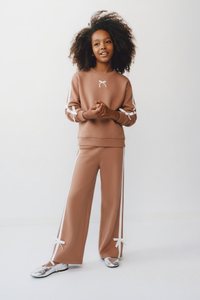 İki parçalı takım. Bisiklet yaka, uzun kollu sweatshirt. Göğüs kısmında küçük fiyonk nakışlı. Yanları beyaz şeritli, cepli, paça kurdele detaylı eşofman altı.
