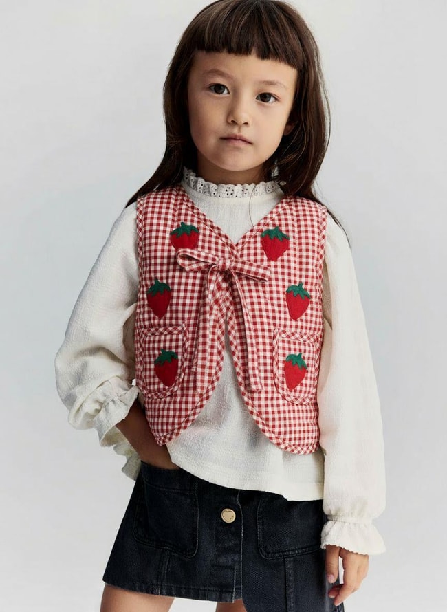 Kız çocuk pamuklu kırmızı ekose çilek nakışlı yelek, hem şirin görünümü hem de kullanışlı tasarımıyla miniklerin dolabında öne çıkıyor. Yumuşak pamuklu dokusu sayesinde cilt dostu olan bu yelek, gün boyu konfor sunar. Ön kısmında yer alan bağcık detayı, hem estetik bir görünüm kazandırır hem de pratik kullanım sağlar. Cepler üzerinde yer alan çilek nakışları, ürüne eğlenceli ve neşeli bir karakter katar. Elbise, etek veya pantolonlarla kolayca kombinlenebilen bu yelek, bahar ve yaz aylarında dış giyim olarak ideal bir tercihtir. Ayrıca hediye olarak da şık bir seçenektir.