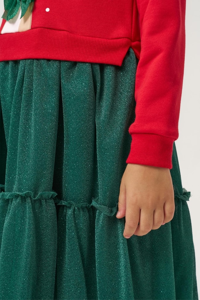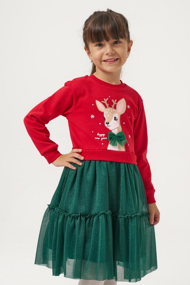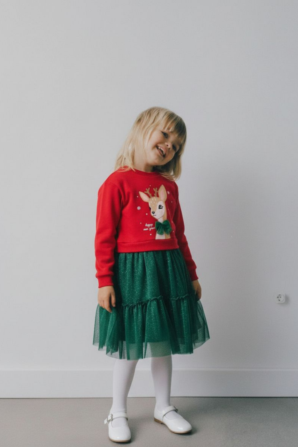 Yılın en neşeli zamanları için tasarlanan bu kırmızı sweatshirt ve yeşil tül etek takımı, miniklerin enerjisini yansıtıyor. Pamuklu kumaşıyla cilde dost bir konfor sunarken, yumuşak dokusu sayesinde gün boyu rahatlık sağlar. Geyik baskılı sweatshirt, eğlenceli detaylarıyla dikkat çeker; ışıltılı tül eteği ise kutlama günlerine zarif bir dokunuş katar.
