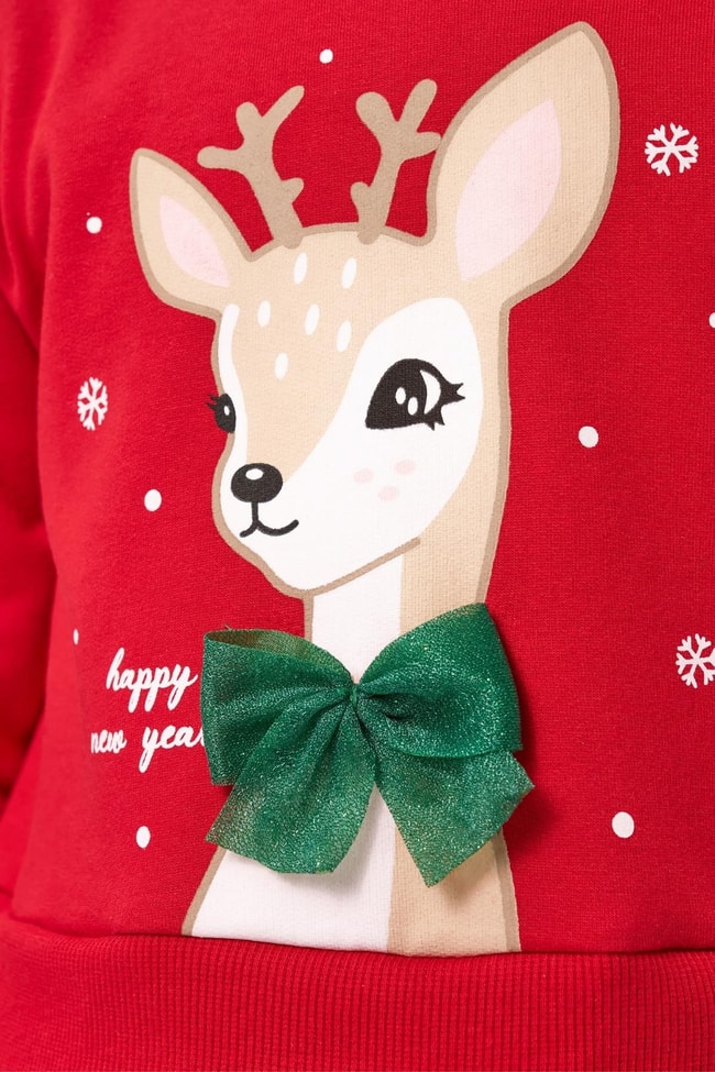 İki parçalı takım. Bisiklet yaka, uzun kollu geyik baskılı sweatshirt. Işıltılı tül detaylı astarlı etek.