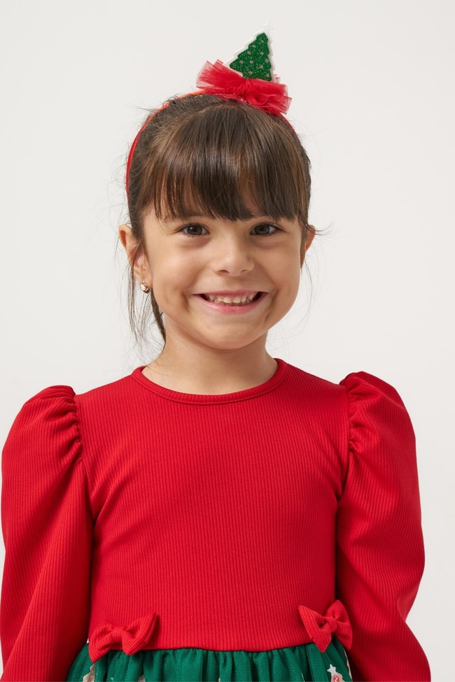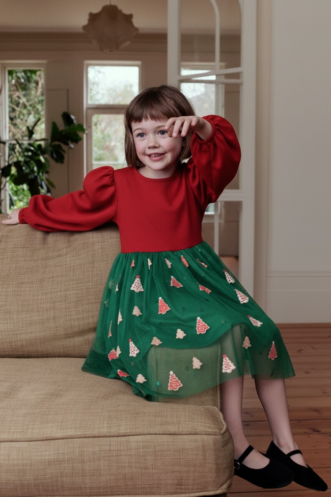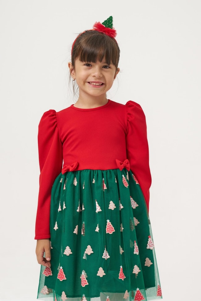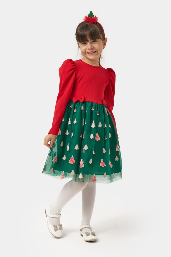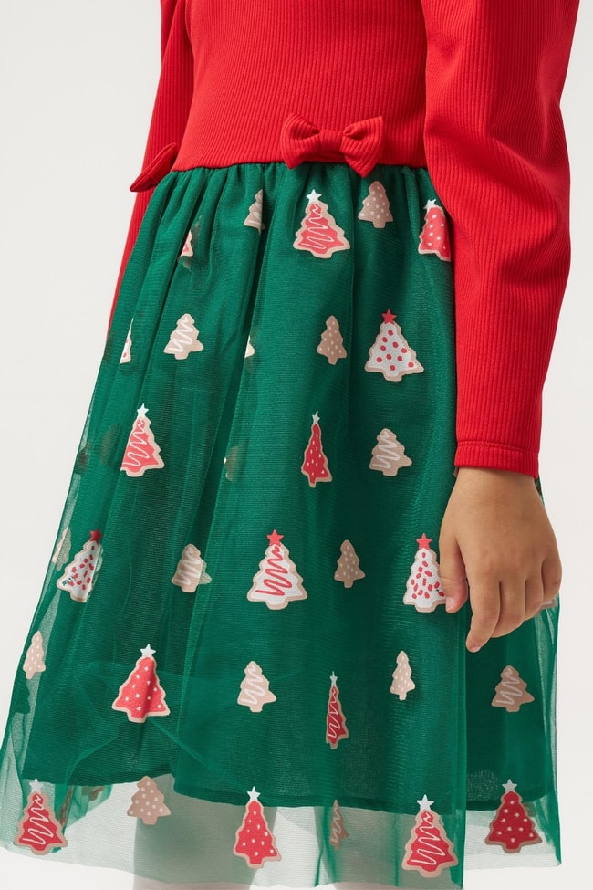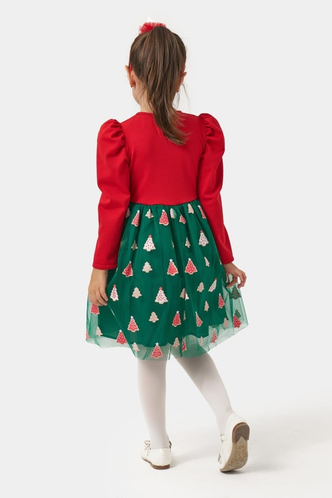 Pamuklu kumaşlı elbise. Uzun kollu kırmızı üst kısım. Yeşil tül etek, Noel ağacı desenli detaylarla süslenmiştir.