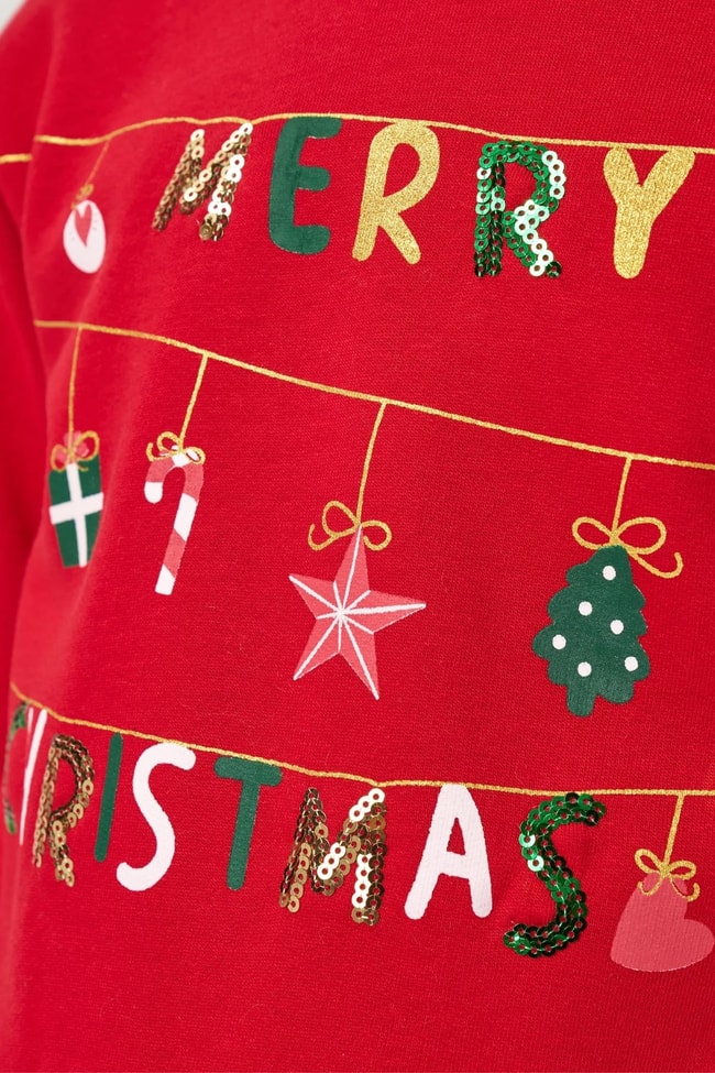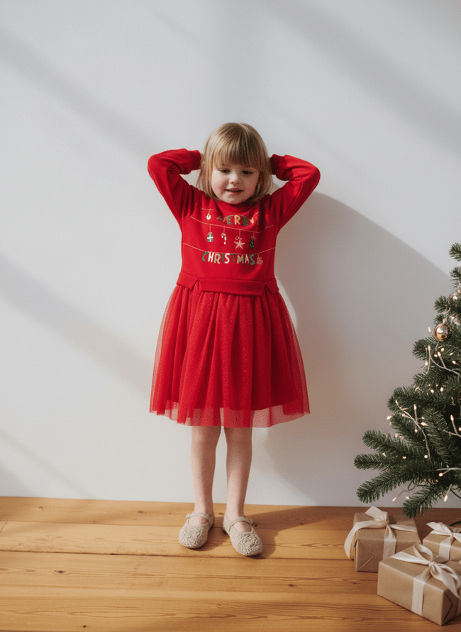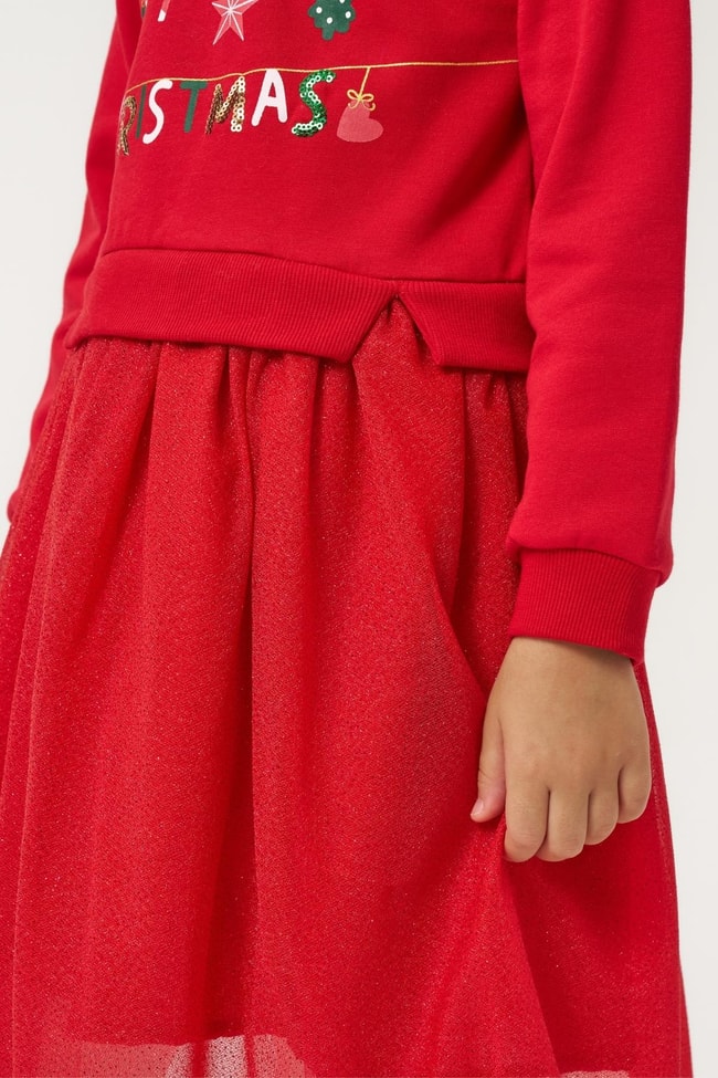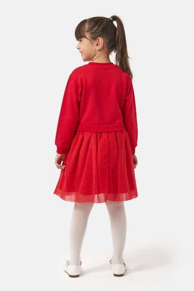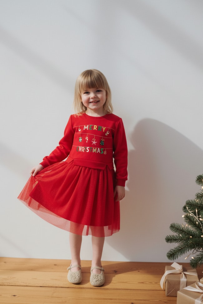 Yumuşak pamuklu kumaştan üretilmiş, tül etek detaylı yeni yıl temalı elbise. Uzun kollu, yuvarlak yaka, üzeri renkli baskı detaylı.