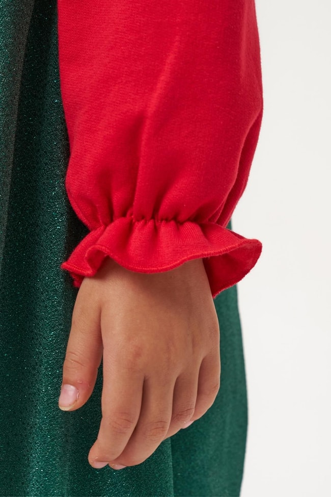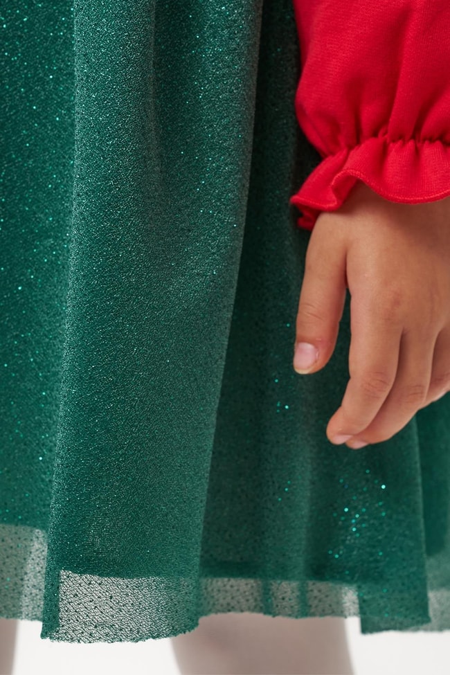 Kız çocuklar için özel olarak tasarlanan bu pamuklu yılbaşı elbisesi, zarif kırmızı üstü ve ışıltılı yeşil tül eteğiyle dikkat çekiyor. Göğüs kısmındaki yılbaşı ağacı baskısı, miniklerin enerjisine neşe katarken; pamuklu dokusu gün boyu rahatlık sağlıyor. Uzun kollu formu ve arkadan düğmeli tasarımıyla kolay giyilir, özel günlerde, fotoğraf çekimlerinde veya aile kutlamalarında göz alıcı bir görünüm sunar. Parıltılı tül etek, her adımda ışıltılı bir etki yaratır.