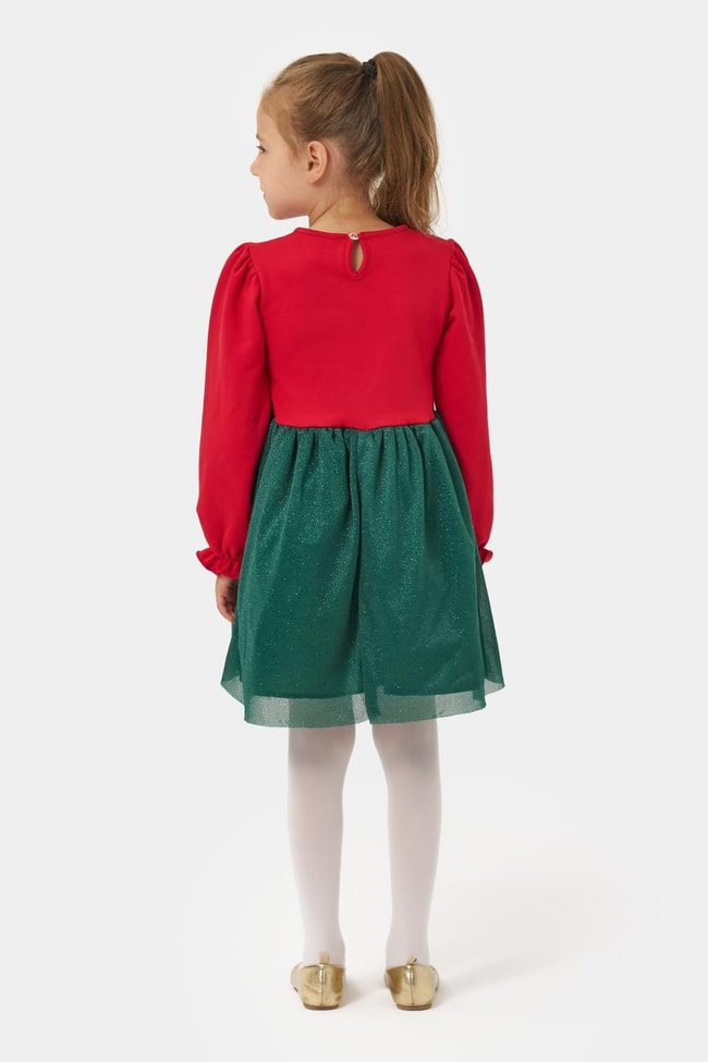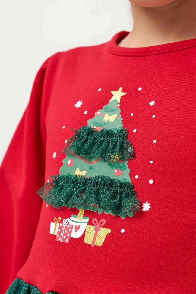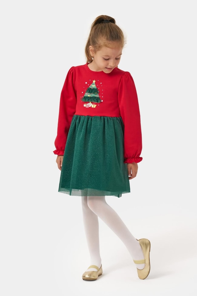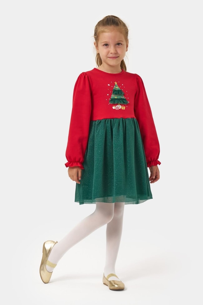 Uzun kollu, pamuklu kumaştan üretilmiş yılbaşı temalı elbise. Üst kısmı baskılı, alt kısmı parlak tül etekli. Arkadan düğmeli, rahat ve şık tasarım.