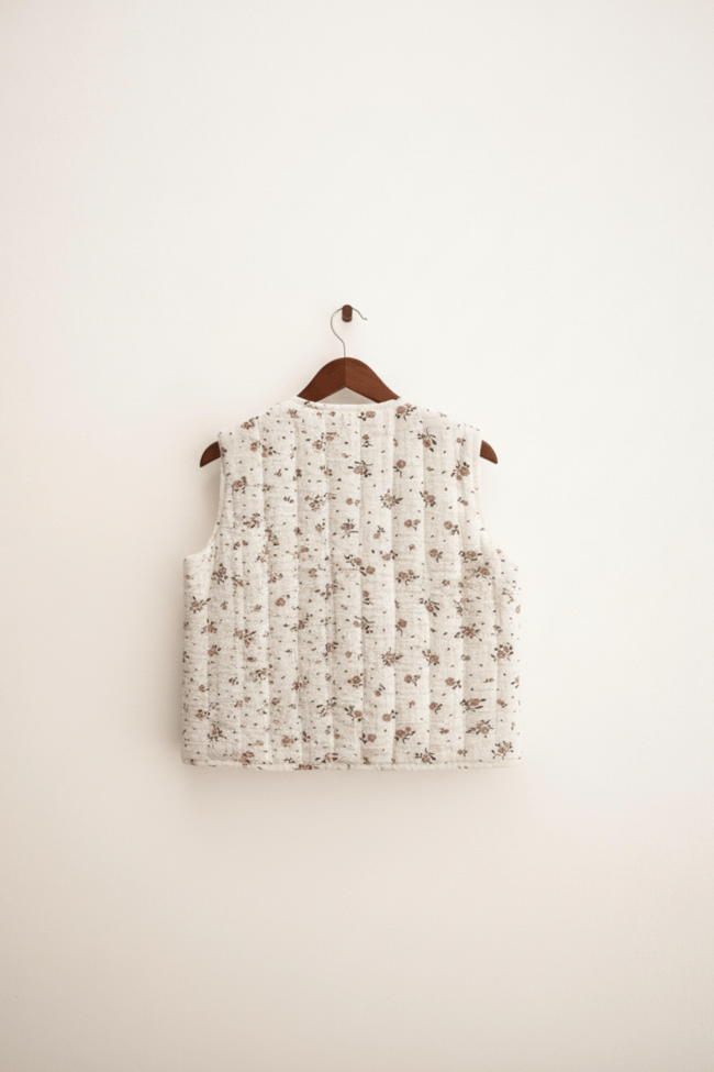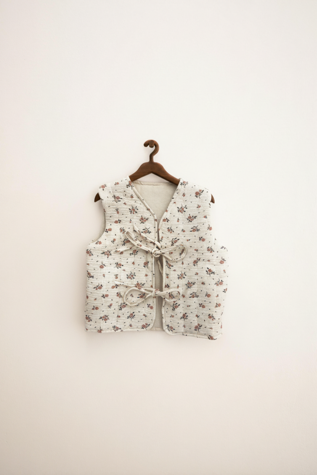 Pamuklu kumaştan üretilmiş, çiçek desenli bağlamalı yelek. İç kısmı yumuşak astarlıdır, hafif dolgulu yapısıyla serin günlerde ideal konfor sunar.
