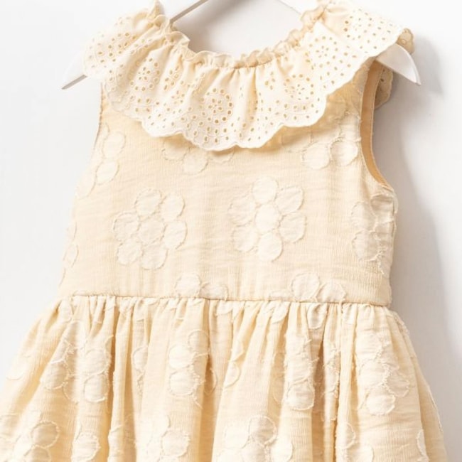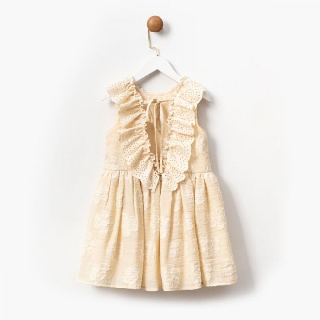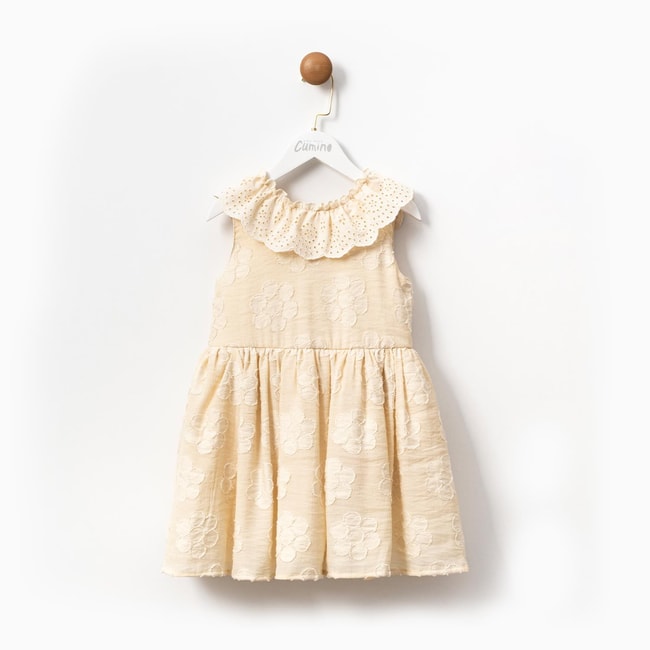 Doğal pamuklu kumaşı sayesinde yumuşak ve nefes alabilen bu krem renkli kız çocuk elbisesi, yaz aylarında hem şık hem de konforlu bir kullanım sunar. Üzerindeki çiçek işlemeleri ve broderie anglaise (delik işli) fırfırlı yaka detayıyla romantik bir görünüm kazandırılmıştır.