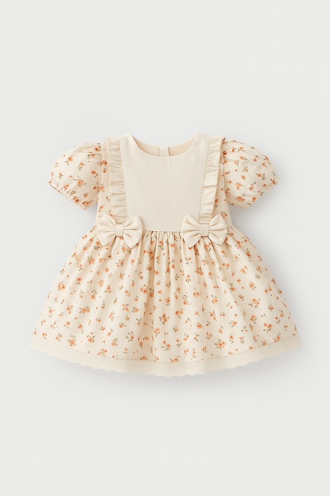 Zarif ve nostaljik tasarımıyla öne çıkan bu kız çocuk elbisesi, %100 pamuklu yumuşak dokusu sayesinde miniklerin hassas cildine uyum sağlar. Krem zemin üzerine işlenmiş minik turuncu çiçek desenleriyle hem şık hem de doğal bir görünüm sunar. Elbisenin ön kısmında yer alan iki zarif fiyonk, tasarıma sevimli bir detay katar. Puff kollu formu ve omuzdan aşağı inen fırfır şeritleriyle vintage bir hava yaratır. Alt kısmındaki dantel işlemeli etek ucu ise elbiseye sofistike bir dokunuş kazandırır. Özel günler, doğum günü partileri ya da günlük kullanım için idealdir. Nefes alabilen kumaşıyla yaz aylarında ferah kullanım sunar.