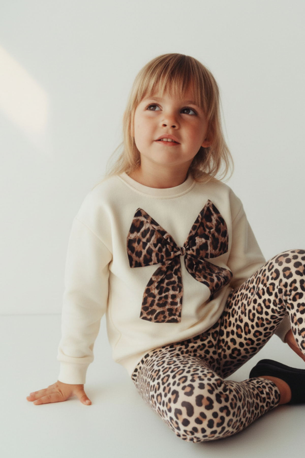 Krem sweatshirt’ün ön kısmındaki büyük leopar fiyonk detayı zarif bir dokunuş kazandırırken, taytın esnek yapısı hareket özgürlüğü sunar. Günlük kullanım, doğum günü kutlamaları veya fotoğraf çekimleri için ideal bir tercihtir.