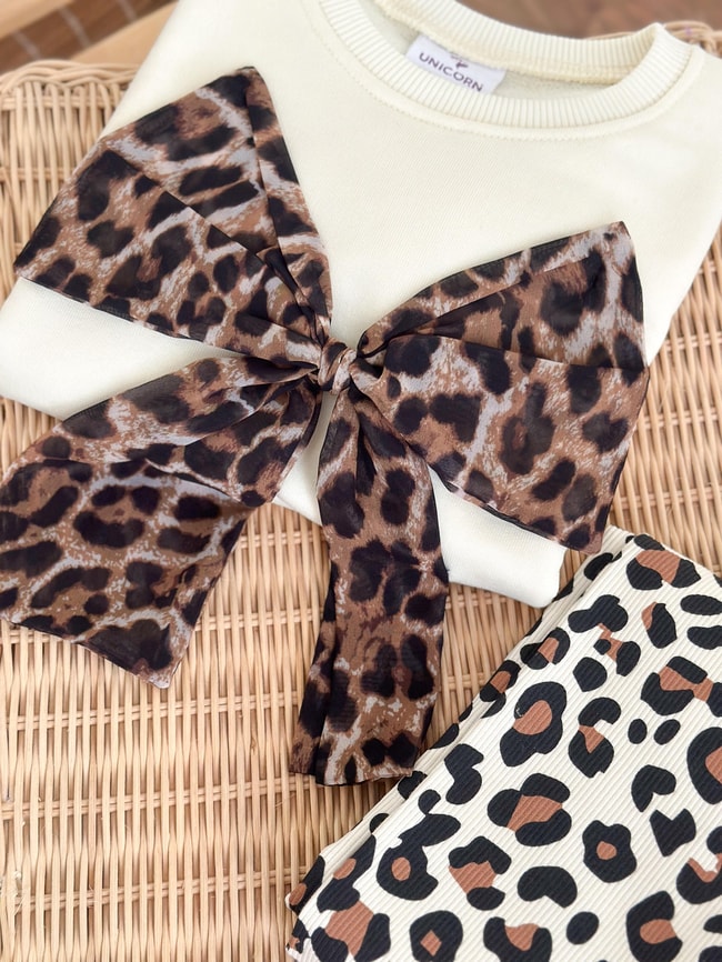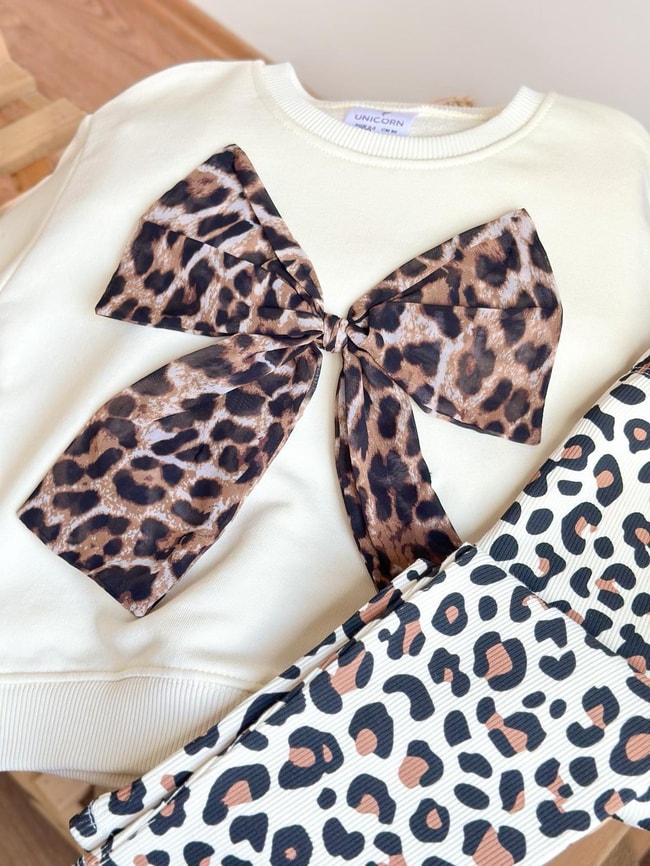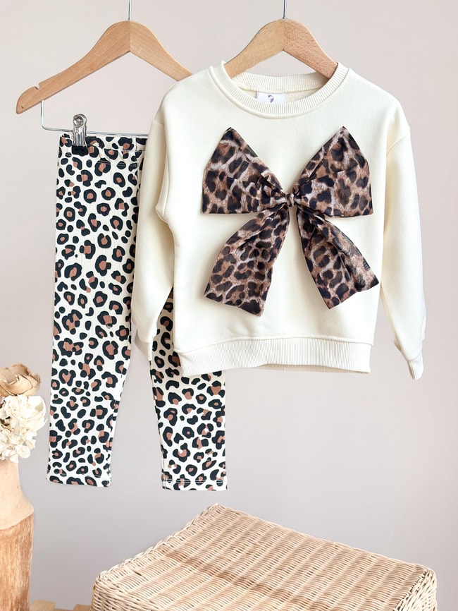 Yumuşak pamuklu kumaştan üretilmiş iki parçalı takım. Leopar fiyonk detaylı sweatshirt ve esnek taytıyla hem şık hem konforlu bir görünüm sunar.