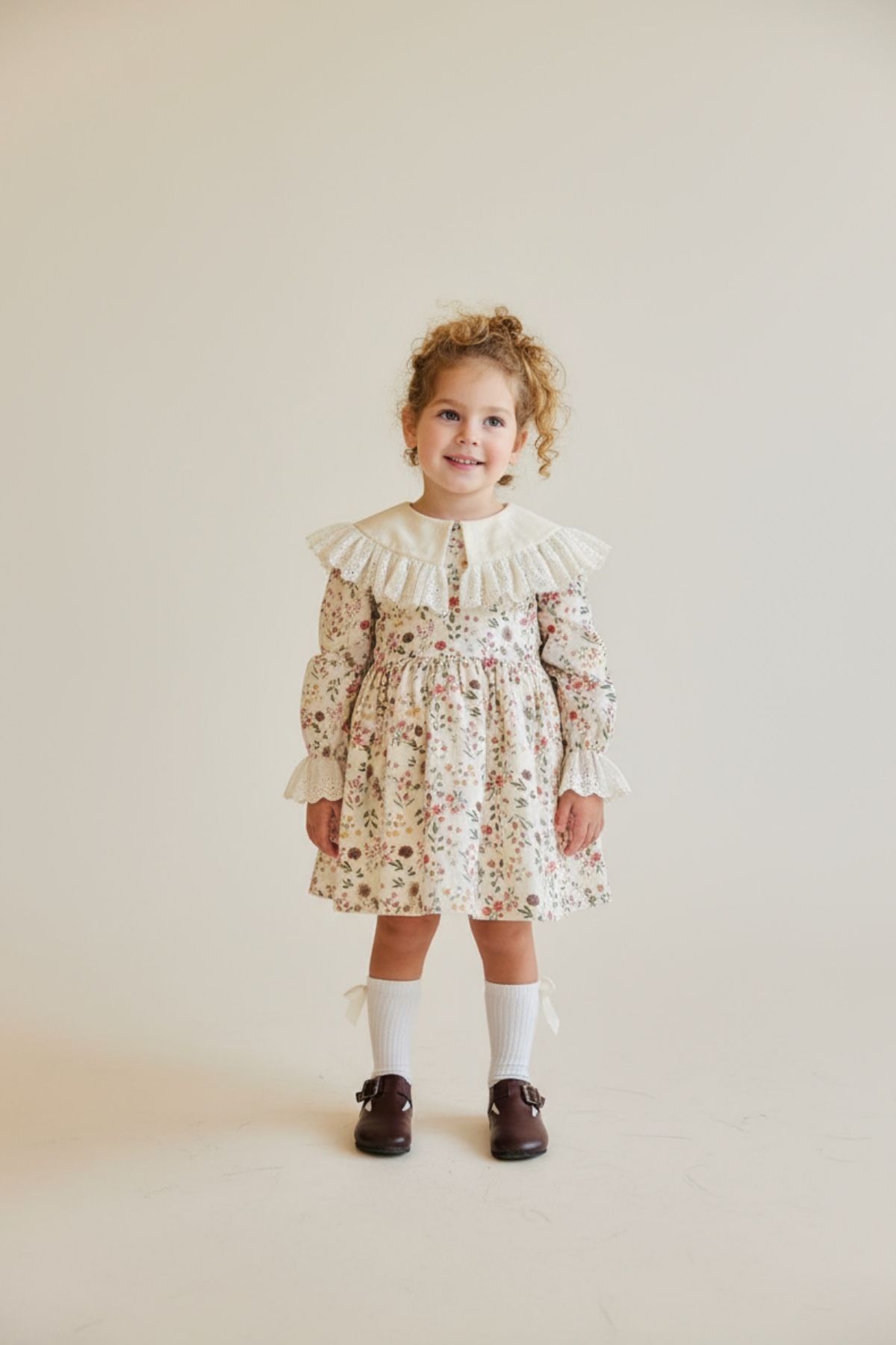 Klasik vintage tarzda tasarlanmış, çiçek desenli pamuklu kumaş elbise. Dantelli geniş yaka ve kol detaylarıyla özel günlerde zarif, günlük kombinlerde konforlu bir şıklık sunar.