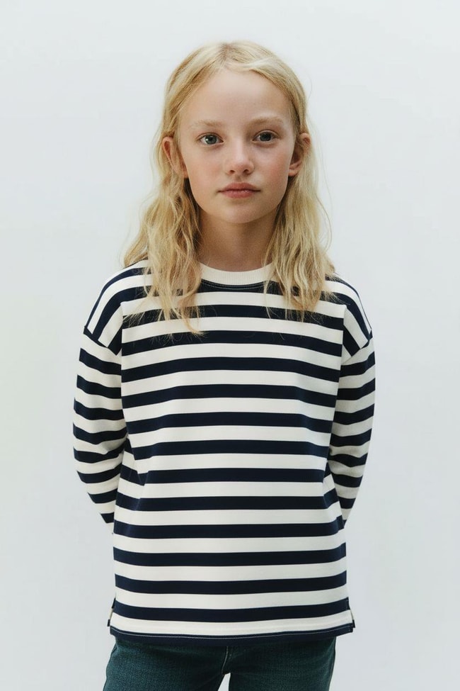 Pamuklu kumaştan, bisiklet yaka, uzun kollu çizgili sweatshirt. Yumuşak dokulu ve rahat kesimiyle günlük kombinler için ideal.