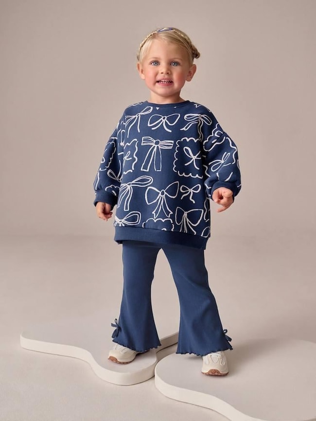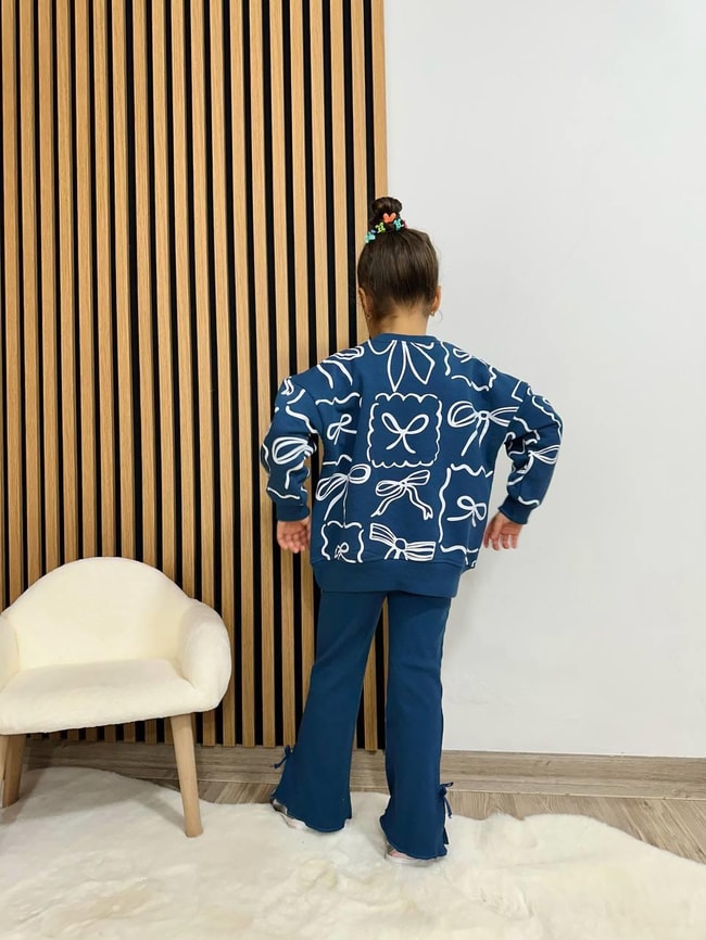 Kız çocuklar için konfor ve şıklığı bir araya getiren bu lacivert pamuklu takım, gün boyu rahat kullanım sağlar. Üst kısmında yer alan fiyonk desenli sweatshirt, oversize kesimiyle hareket özgürlüğü sunarken modern bir görünüm kazandırır. Alt kısmında bulunan volan paça detaylı eşofman, elastik beli sayesinde kolay giyilir ve miniklerin enerjik günlerine uyum sağlar.