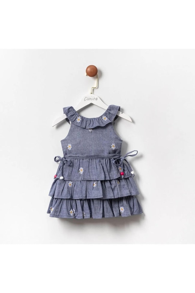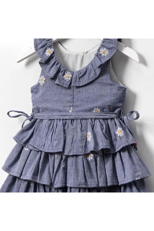 Kız Çocuk Pamuklu Mavi Papatya Nakışlı Kat Kat Elbise - Fırfır Yaka Detaylı