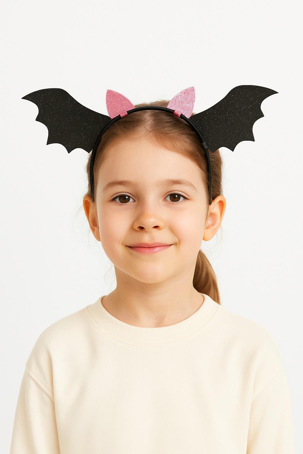 Parlak siyah yarasa kanatlı taç. Simli pembe kulak detaylı, hafif pamuklu dokuda. Kostüm partileri ve temalı kutlamalar için idealdir.