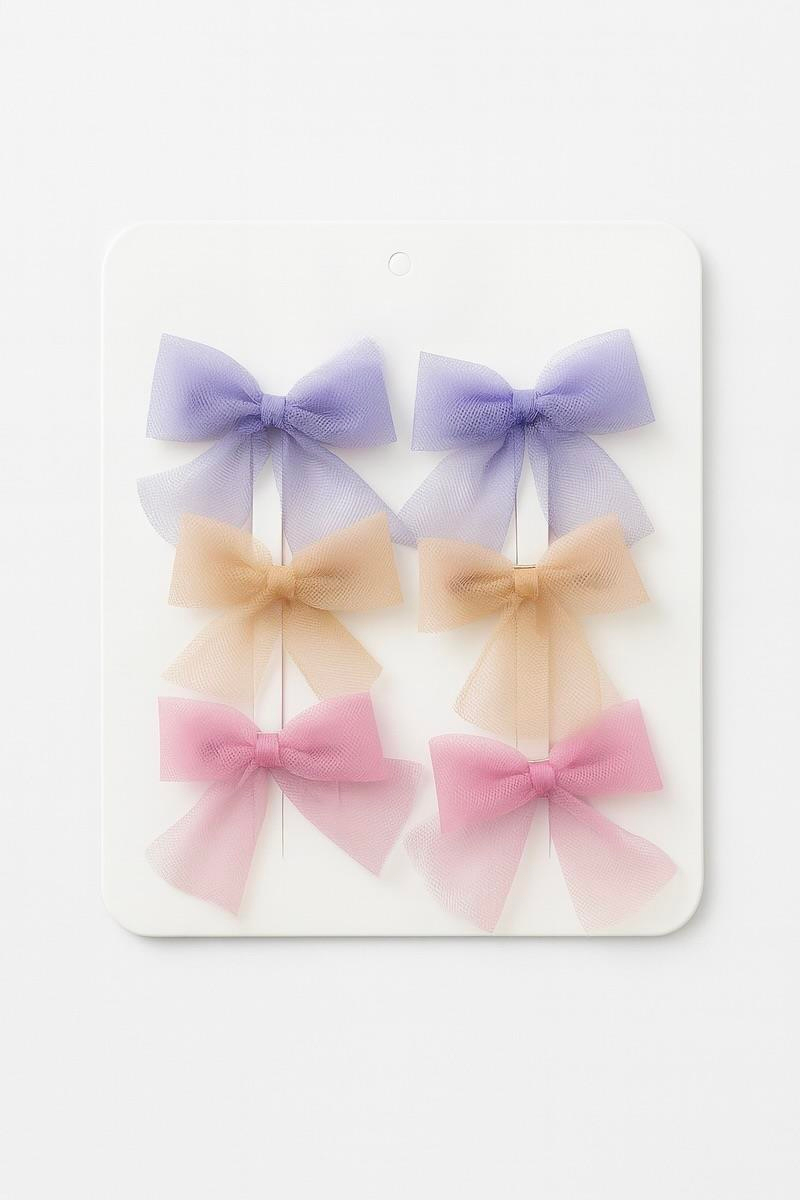 Altı parçadan oluşan toka seti. Lila, bej ve pembe tonlarında pamuklu tül fiyonk detaylı. Günlük ve özel gün kombinleri için idealdir.