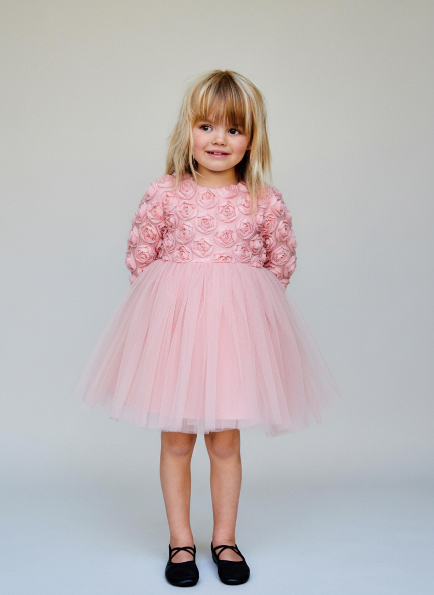Kız Çocuk Pamuklu Pembe Çiçek Desen Aplikeli Tül Elbise - Özel Gün ve Davet Elbisesi