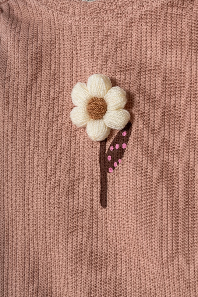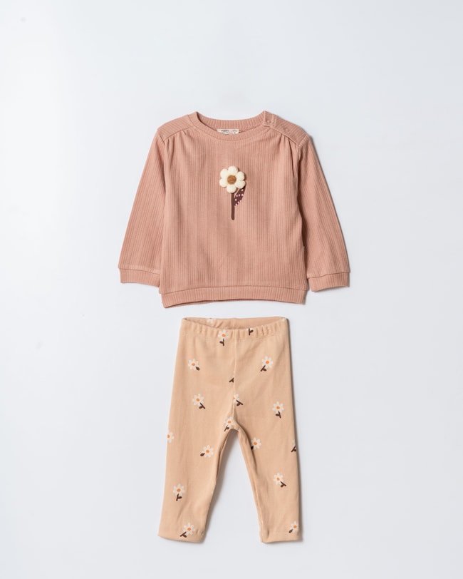 İki parçalı takım. Bisiklet yaka, uzun kollu, çiçek aplikeli pamuklu sweatshirt. Esnek beli ve çiçek desenli pamuklu tayt.