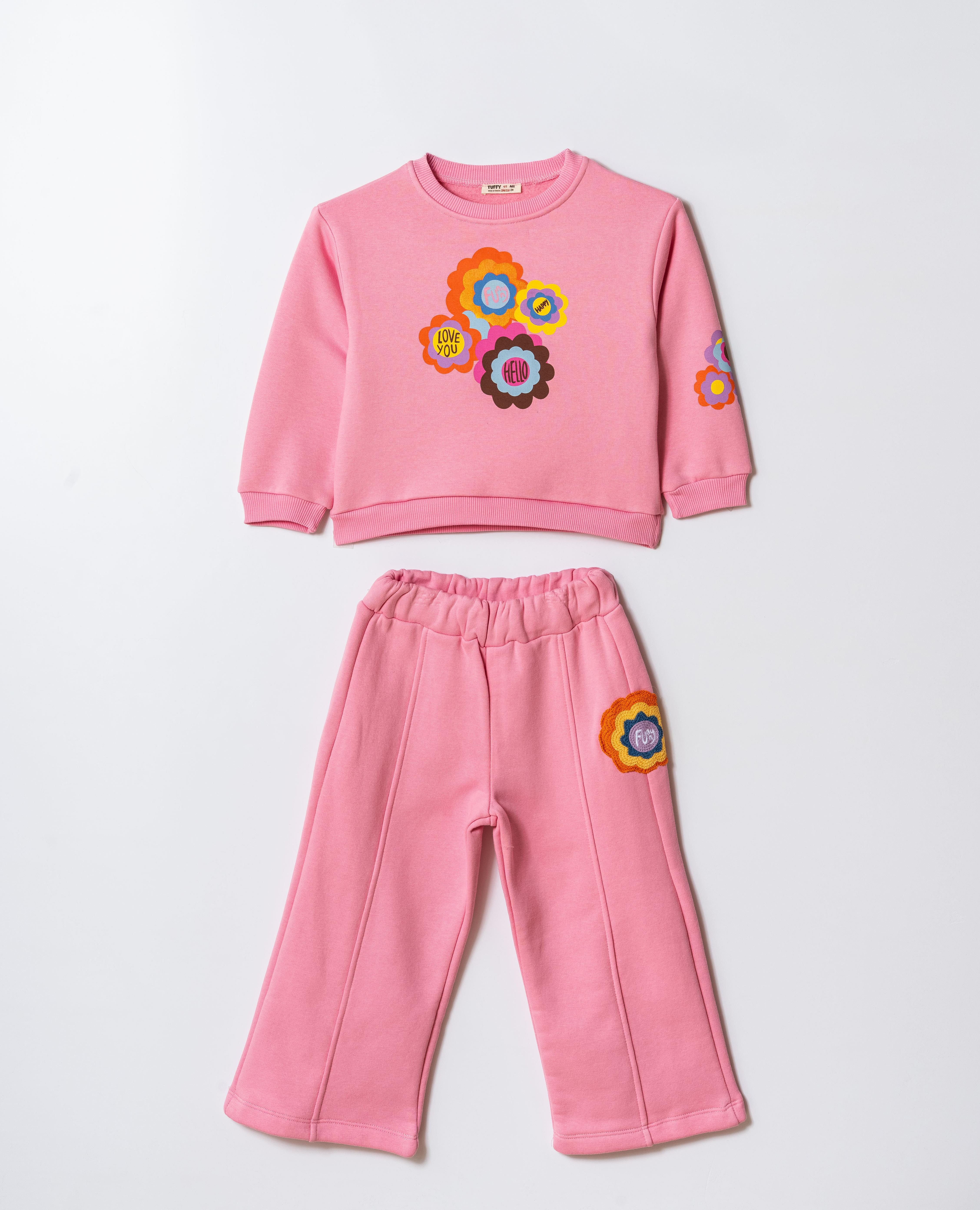 Kız çocuklar için özel olarak tasarlanan pamuklu pembe sweatshirt ve eşofman takımı, enerjik ve eğlenceli bir stil sunuyor. Üst kısmında yer alan rengarenk çiçek baskıları "LOVE YOU", "HELLO" ve "FUN" yazılarıyla dikkat çekerken, bisiklet yaka ve uzun kollu tasarımı günlük kullanım için idealdir. Alt parçada ise yan kısımda bulunan çiçek detayı takımı tamamlayan şık bir dokunuş sağlar.