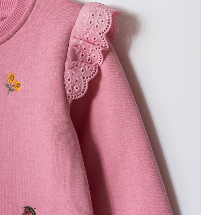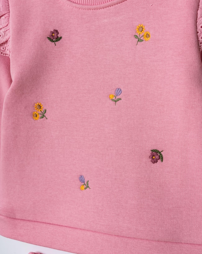 İki parçalı pamuklu takım. Çiçek nakışlı, dantel fırfır detaylı sweatshirt. Elastik belli, nakış işlemeli eşofman altı.