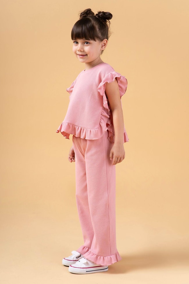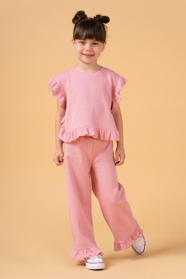 İki parçalı takım. Fırfır detaylı, kısa kollu pamuklu üst. Geniş paçalı ve paça ucu fırfırlı pantolon.