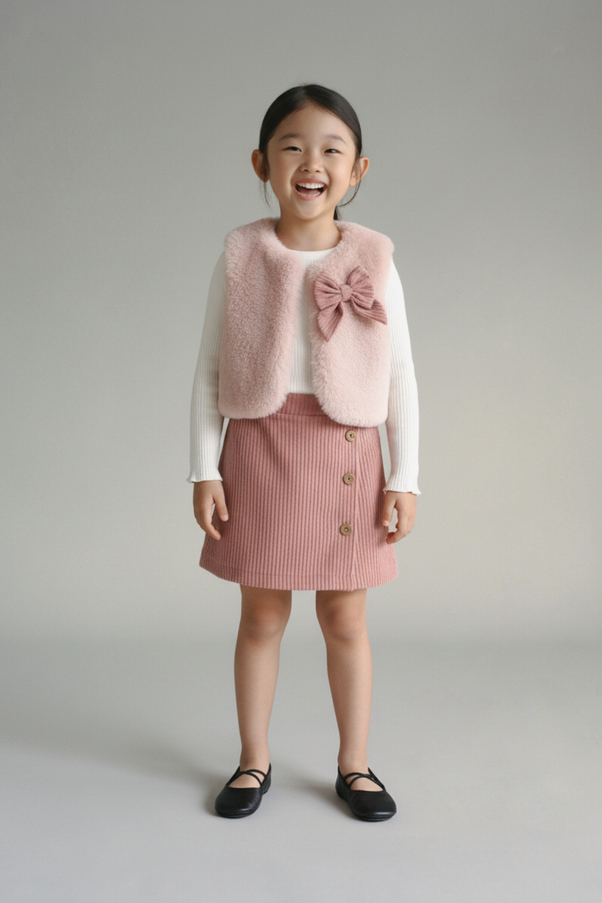 Kürklü yelek, sıcak tutan yapısıyla mevsim geçişleri için idealdir. Pamuklu bluzun nefes alabilir kumaşı ve düğme detaylı mini eteğin konforlu kesimi sayesinde çocuklar gün boyu rahat hisseder. Hem günlük giyimde hem de özel günlerde zarif bir görünüm sunar