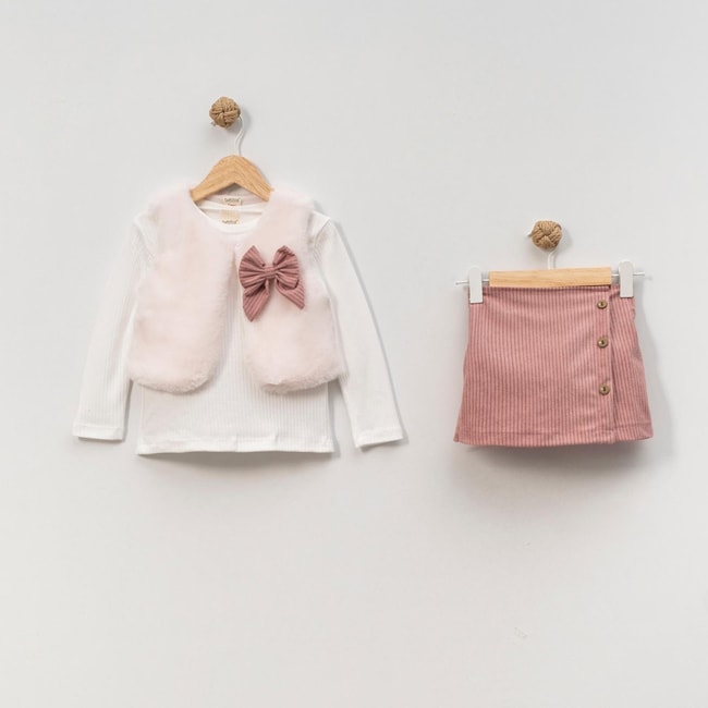Üç parçalı pamuklu takım. Yumuşak dokulu kürklü yelek, fiyonk detaylı zarif tasarım. Düğmeli etek ve uzun kollu basic bluz ile tamamlanır. Günlük ve özel gün kombinleri için idealdir.