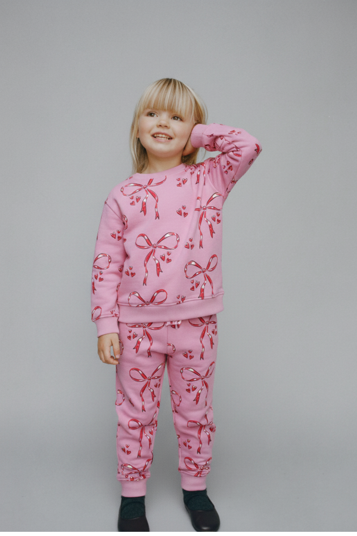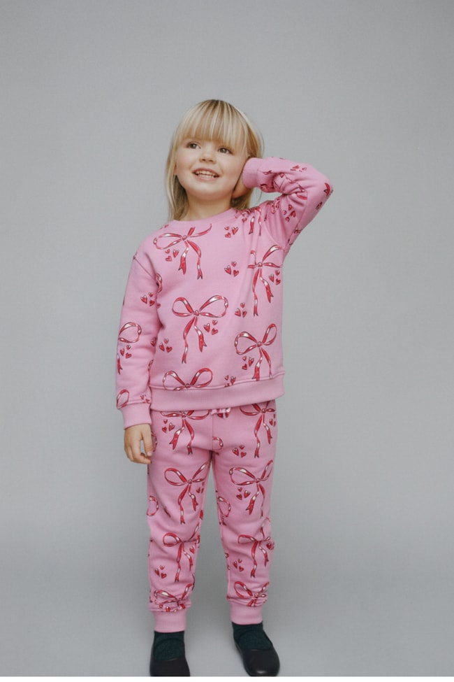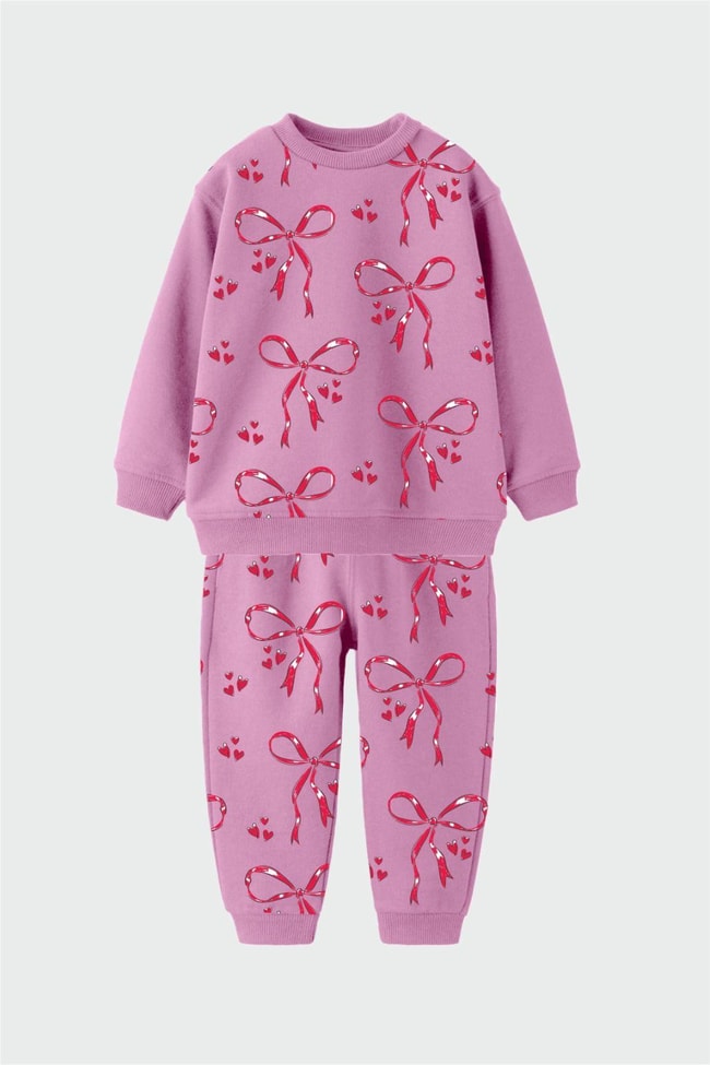 İki parçalı pamuklu takım. Kurdele ve kalp desenli sweatshirt ile uyumlu eşofman altından oluşur. Yumuşak dokusu ve rahat kalıbıyla günlük kullanım için idealdir.
