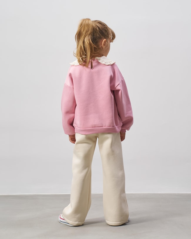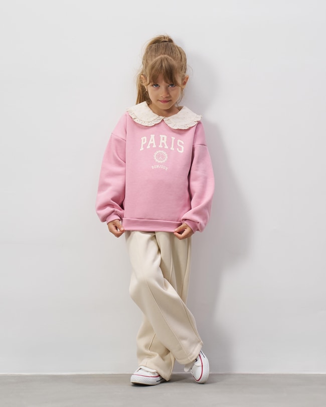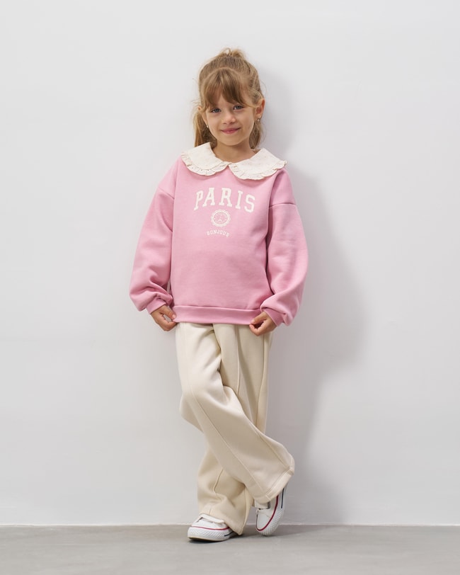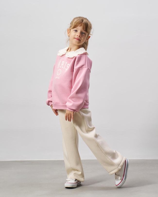 Kız çocuklar için konforu ve şıklığı bir araya getiren bu takım, pembe sweatshirt ve ekru pantolon uyumuyla zarif bir stil sunuyor. Sweatshirt, Paris baskısı ve romantik dantel yaka detayıyla farklı bir görünüm kazandırırken, yumuşak pamuklu yapısı gün boyu rahatlık sağlar. Ekru pantolon ise esnek bel tasarımı ve dikiş detaylarıyla hem günlük kombinlerde hem de özel günlerde kullanım için idealdir. Spor ayakkabılarla rahat, şık ayakkabılarla ise daha klasik bir görünüm elde edilebilecek bu takım, kız çocuk gardırobunun kurtarıcı parçalarından biri olacak.