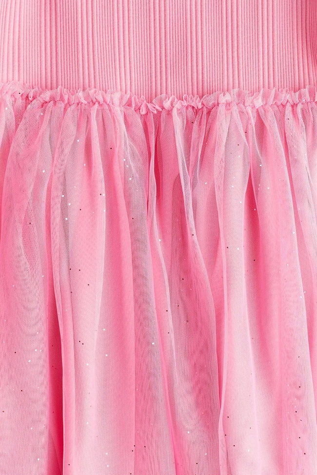 Kısa kollu, pamuklu ribana üst gövde ve simli tül etek detaylı iki parçalı görünüm. Yumuşak dokulu, rahat kesim. Doğum günü, okul etkinliği ve özel günler için ideal.