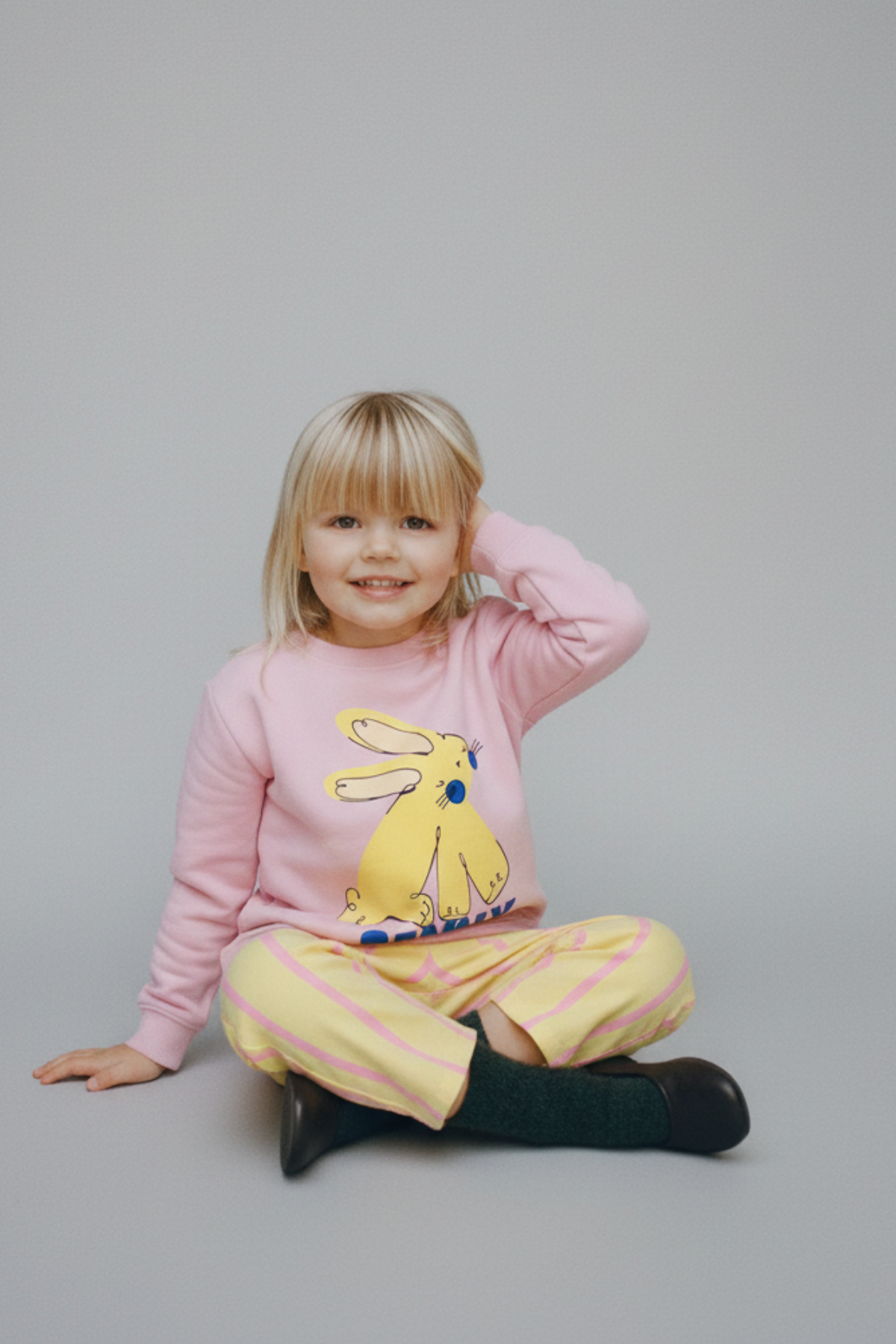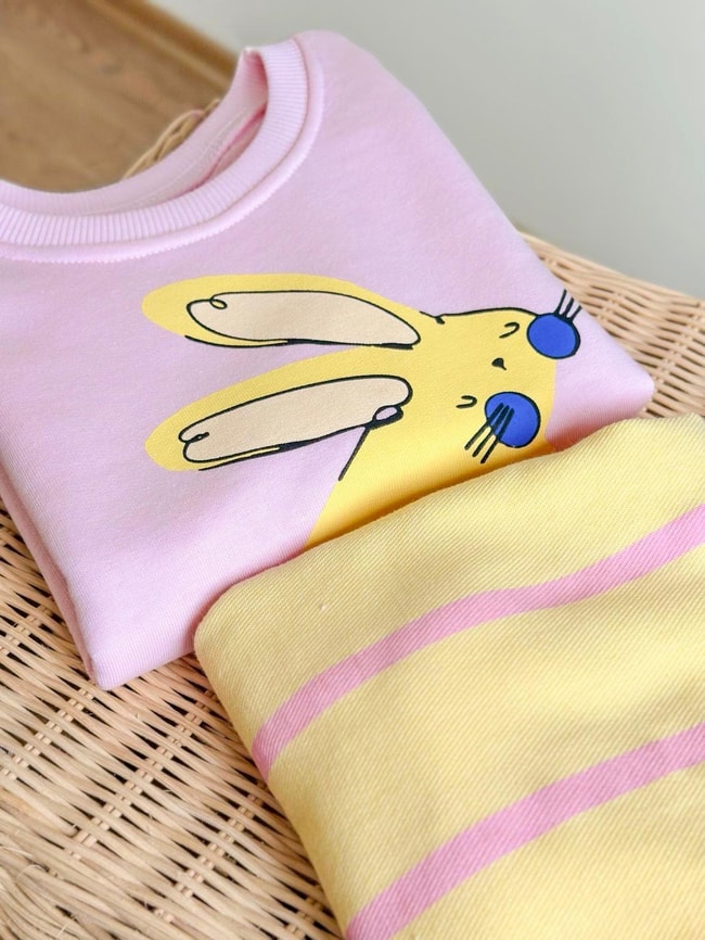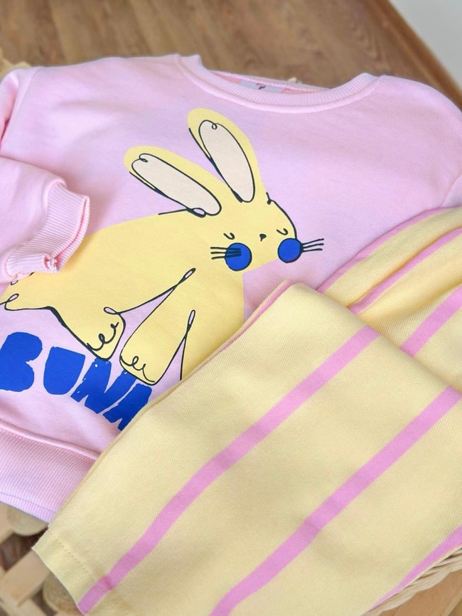 Yumuşak pamuklu kumaştan üretilmiş iki parçalı takım. Tavşan baskılı pembe sweatshirt ve sarı çizgili pantolonuyla konforlu, eğlenceli ve enerjik bir görünüm sunar.