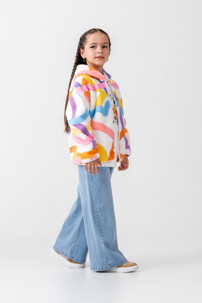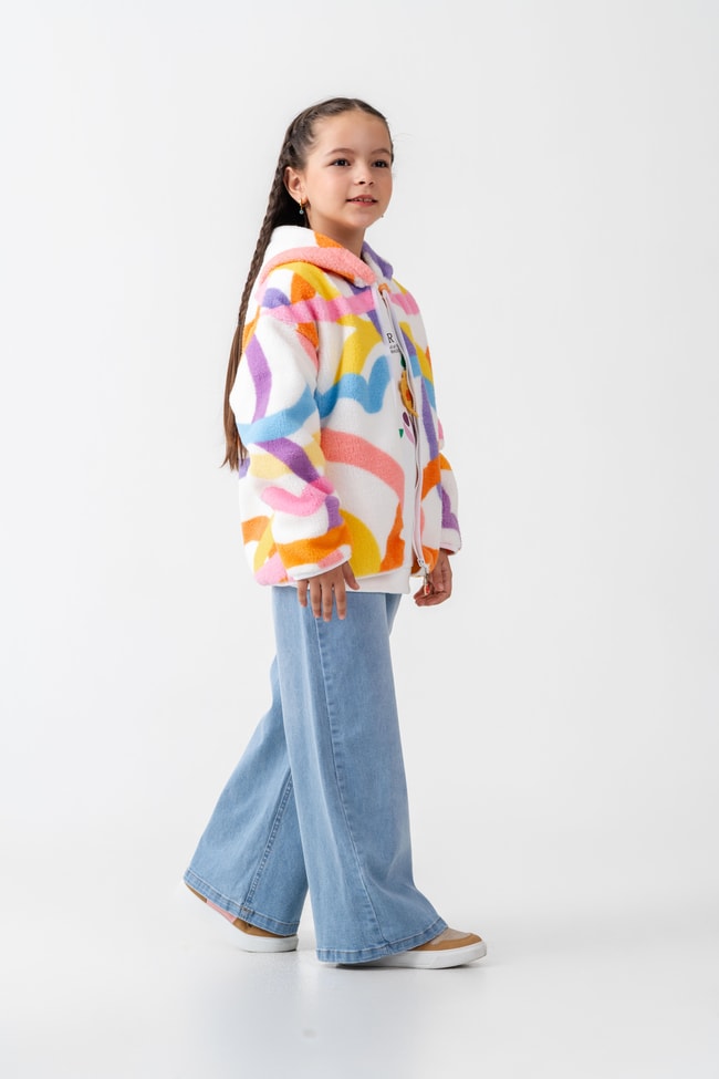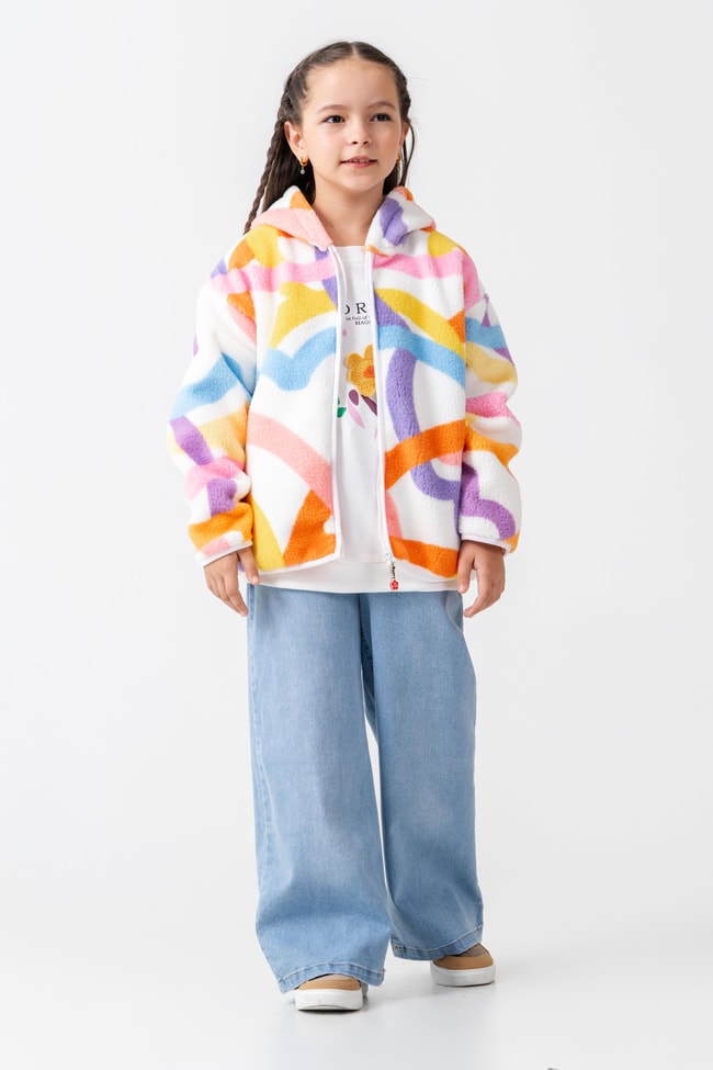 Canlı turuncu, mor, mavi ve sarı tonlarının buluştuğu renkli desenleri sayesinde hem enerjik hem de modern bir görünüm kazandırır. Yumuşacık polar dokusu çocukların cildine dosttur, hafif yapısıyla gün boyu rahat hissettirir.