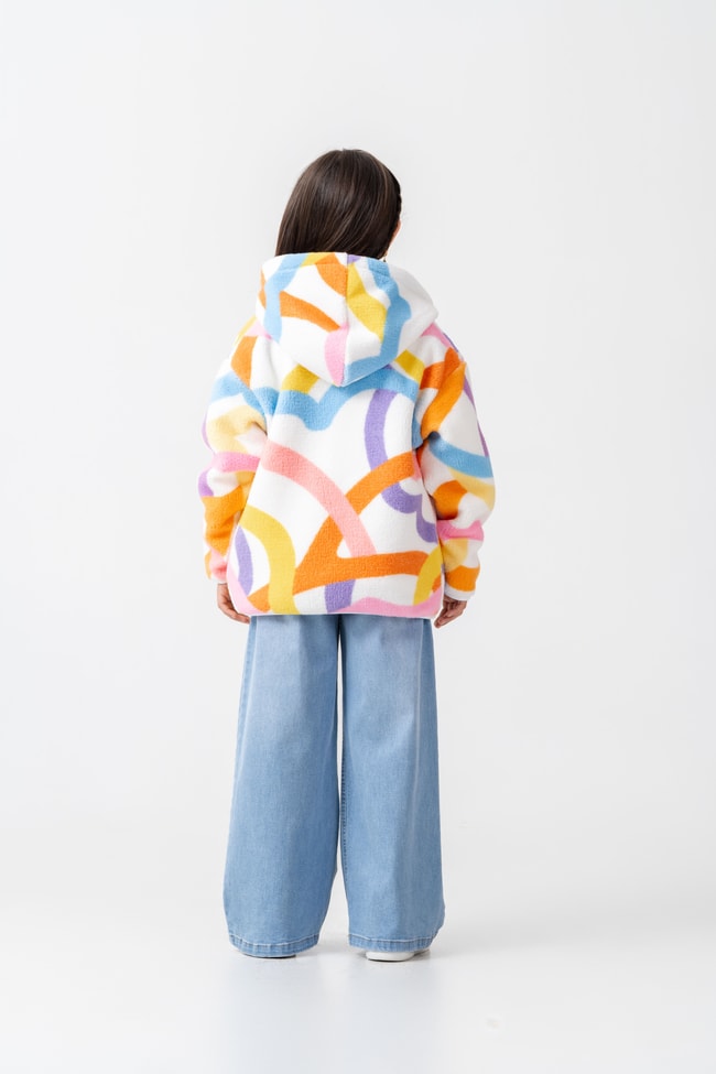 Kapüşonlu, fermuarlı, yumuşak dokulu polar mont. Canlı renkli desenli, uzun kollu, günlük dış giyim.
