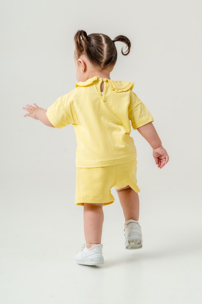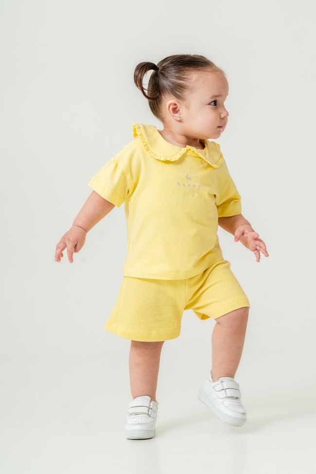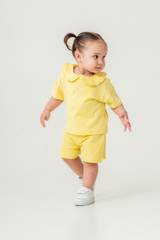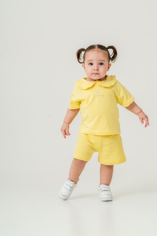 Bu sevimli iki parçalı kız çocuk takımı, yaz mevsimi için hem şık hem de konforlu bir tercih sunuyor. Yumuşak pamuklu kumaştan üretilen kısa kollu t-shirt, dikkat çekici fırfırlı yaka detayı ve ön kısmındaki “be happy” yazısıyla neşeli bir görünüm kazandırır. T-shirt, çocuğunuzun rahatça hareket edebilmesini sağlayan esnek yapısıyla gün boyu konfor sunar. Takımın alt parçası olan şort ise elastik beli ve nefes alabilen dokusuyla sıcak havalarda ferahlık sağlar. Günlük kullanım için ideal olan bu sarı renkli takım, hem evde hem dışarıda rahatlıkla giyilebilir. Hem konforu hem de tarzı bir arada sunan bu takım, yaz gardırobunun favorilerinden olmaya aday.