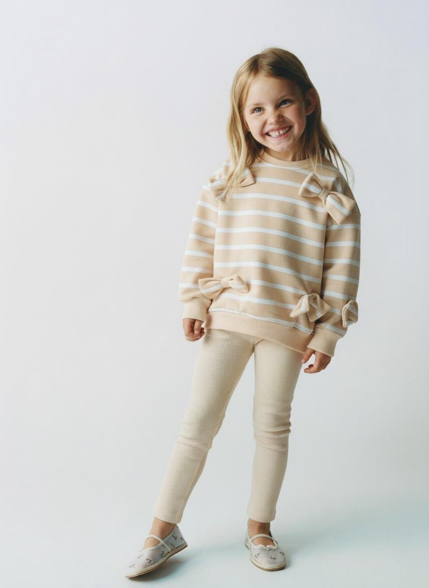 Kız Çocuk Pamuklu Sarı Çizgili Fiyonk Detaylı Sweatshirt ve Ribana Tayt Takım
