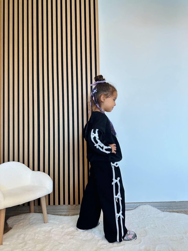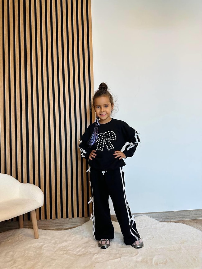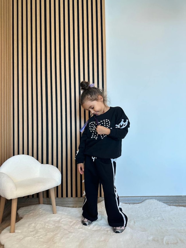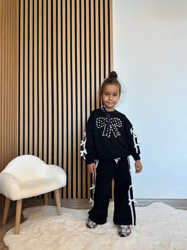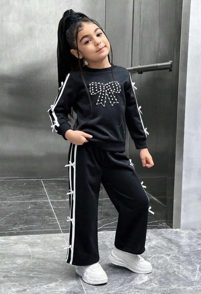 Kız çocuklar için hem rahat hem de şık bir alternatif arıyorsanız, bu siyah pamuklu eşofman takımı tam size göre. Takımın üst parçası bisiklet yaka, uzun kollu ve ön kısmında dikkat çeken incili fiyonk deseniyle zarif bir görünüm sunar. Yanlarda yer alan beyaz şeritler ve kurdele süslemeleri takıma modern bir stil katar.