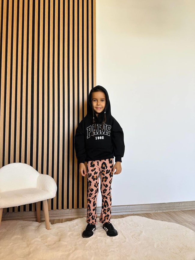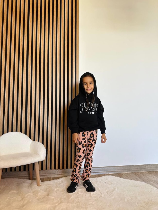 Kız çocuklar için özel tasarlanan pamuklu siyah kapüşonlu sweatshirt ve leopar desenli pantolon takımı, hem şık hem de rahat bir günlük kombin sunuyor. Oversize kesimli, bisiklet yaka ve uzun kollu sweatshirt, ön yüzündeki modern baskı detayıyla sportif bir hava katıyor. Elastik beli sayesinde rahat kullanım sağlayan pamuklu pantolon ise dikkat çekici leopar deseniyle stil sahibi bir görünüm sunuyor.