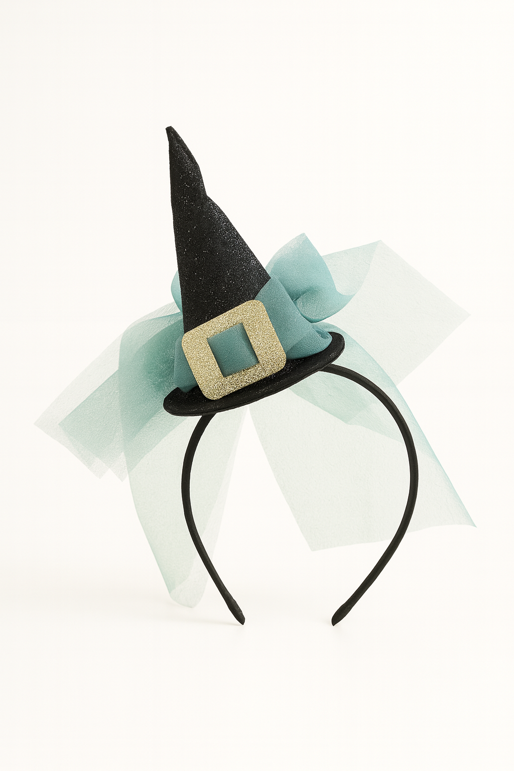 Kız çocuklar için özel olarak tasarlanan bu Halloween temalı taç, siyah mini şapka formu ve büyük tül fiyonk detaylarıyla şık bir görünüm sunar. Simli tokası ışığı yansıtarak göz alıcı bir etki yaratır, yumuşak pamuklu taç kısmı ise gün boyu konforlu kullanım sağlar.