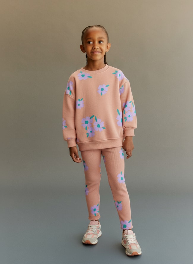 İki parçalı takım. Bisiklet yaka, uzun kollu çiçek desenli sweatshirt. Esnek bel detaylı, dar kesim tayt.