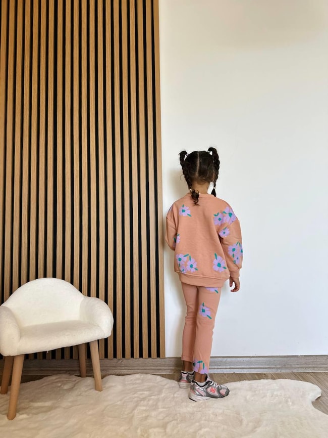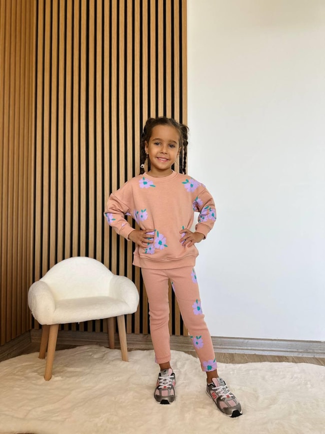 Kız çocuklar için özel olarak tasarlanan bu pamuklu somon takım, hem rahatlığı hem de şıklığı bir arada sunar. Üzerindeki mor ve mavi tonlardaki çiçek desenleri ile enerjik ve sevimli bir görünüm kazandırır. Sweatshirt modeli bisiklet yaka ve uzun kollu yapısıyla günlük kullanım için idealdir. Takımı tamamlayan esnek bel detaylı tayt ise çocuğunuzun gün boyu rahat hareket etmesini sağlar. Okulda, parkta veya günlük gezilerde rahatlıkla tercih edilebilecek bu eşofman takımı, pamuklu kumaşı sayesinde cilde dosttur ve gün boyu konfor sunar.