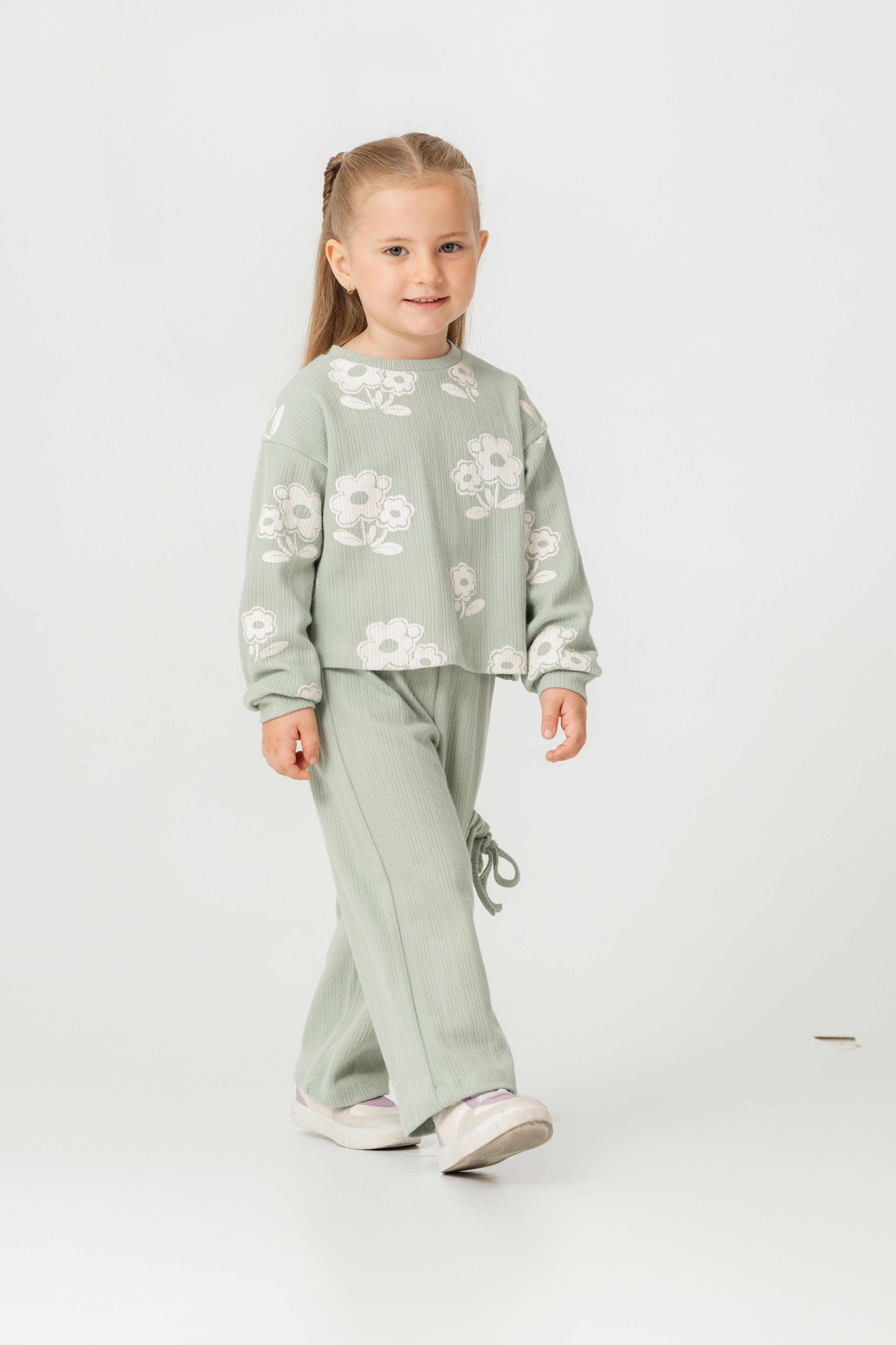 İki parçalı takım. Bisiklet yaka, uzun kollu, çiçek desenli üst. Yan cepli, bağcıklı detaylı, düz paça müslin pantolon.