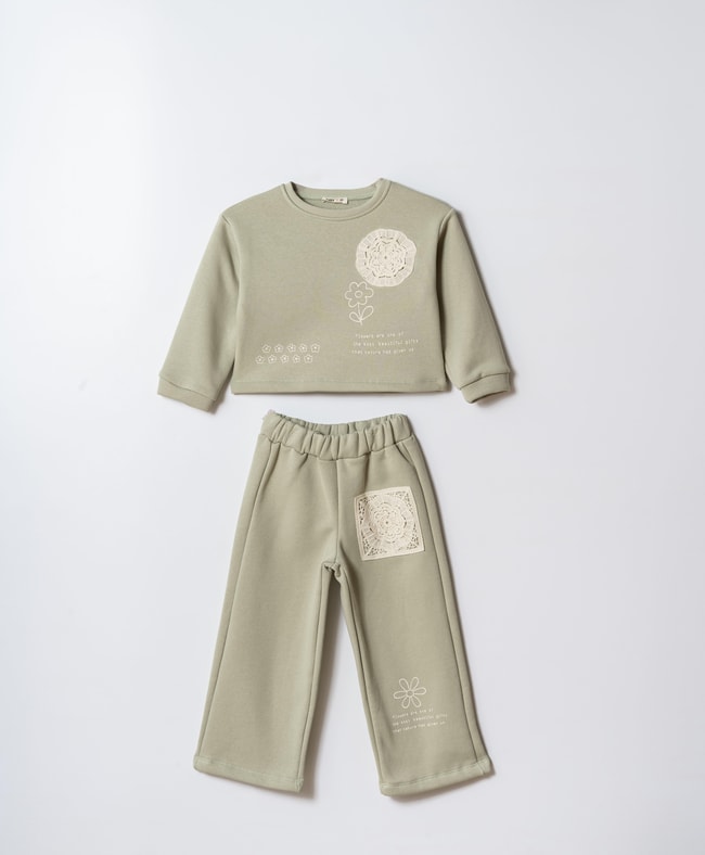 İki parçalı takım. Bisiklet yaka, uzun kollu, dantel aplikeli ve yazı baskılı sweatshirt. Üzeri dantel detaylı, elastik belli geniş paça alt.