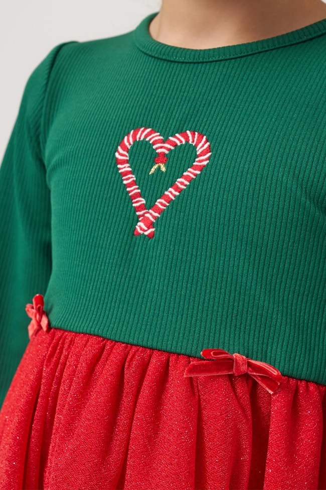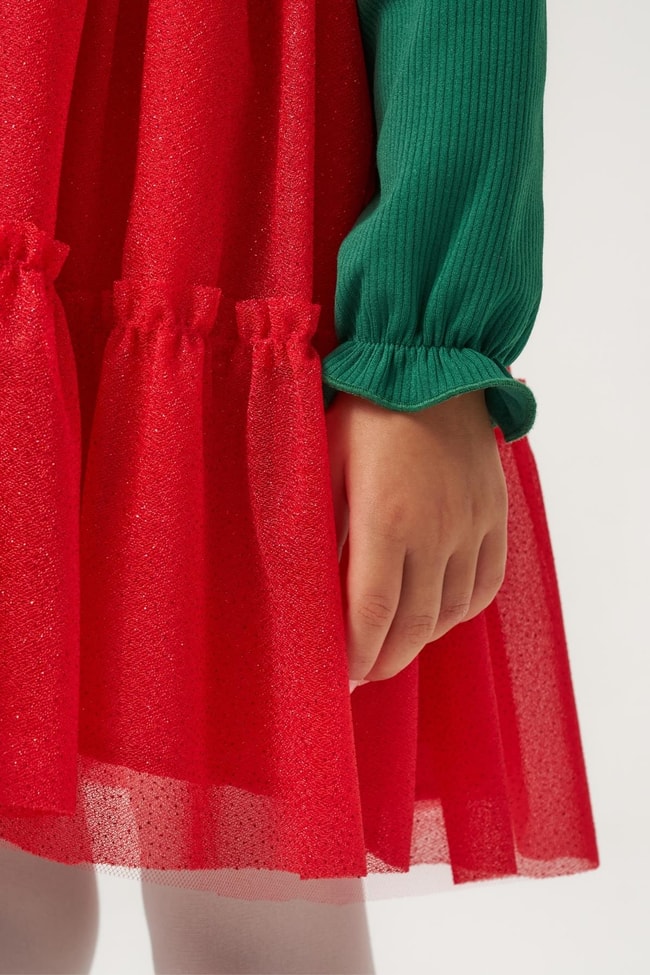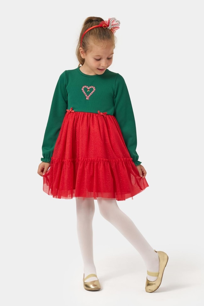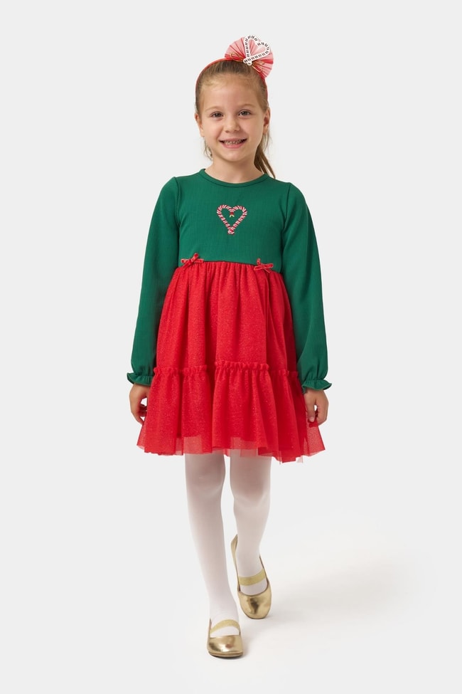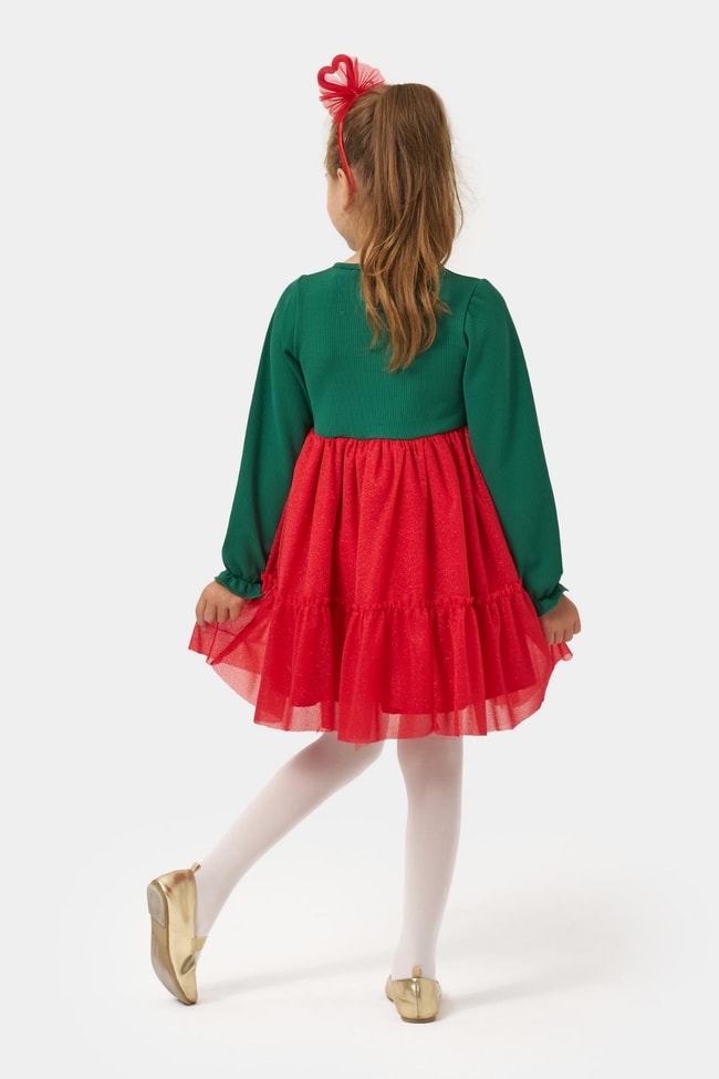 Yumuşak pamuklu kumaştan üretilmiş, yeşil üst kısmı kalp nakış detaylı, kırmızı tüllü etek bölümüyle hareketli bir görünüm sunan iki renkli elbise. Uzun kollu, rahat kalıp tasarım.