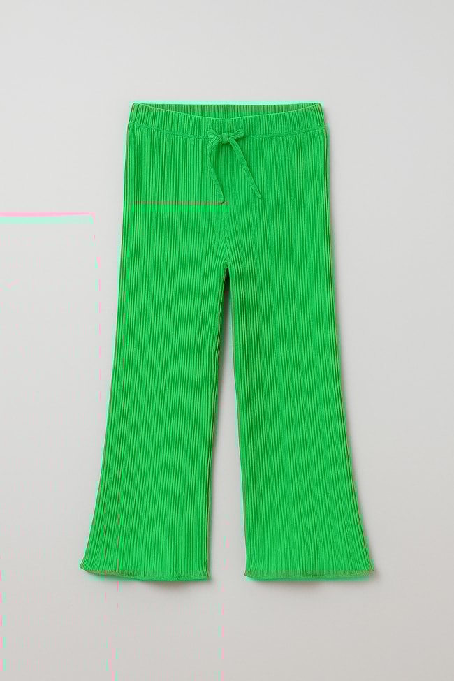 Kız çocuk pamuklu yeşil ribana flare pantolon, modern tasarımı ve konforlu yapısıyla günlük kombinlerin vazgeçilmezi oluyor. Yumuşak pamuklu ribana kumaşı sayesinde esnek, hafif ve cilde dosttur. Esnek bel bandı ve ipli bağcık detayı, hem rahat kullanım hem de ayarlanabilir bir konfor sağlar.