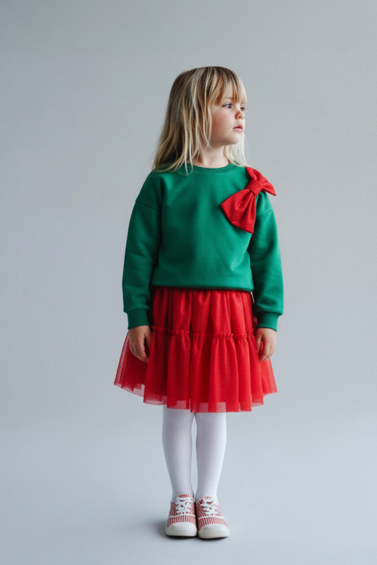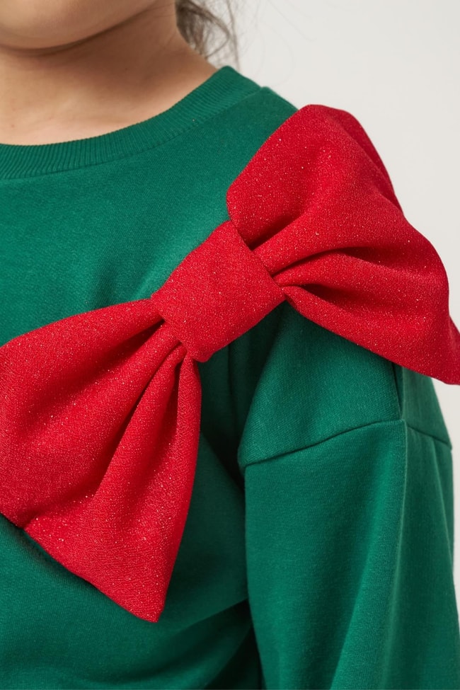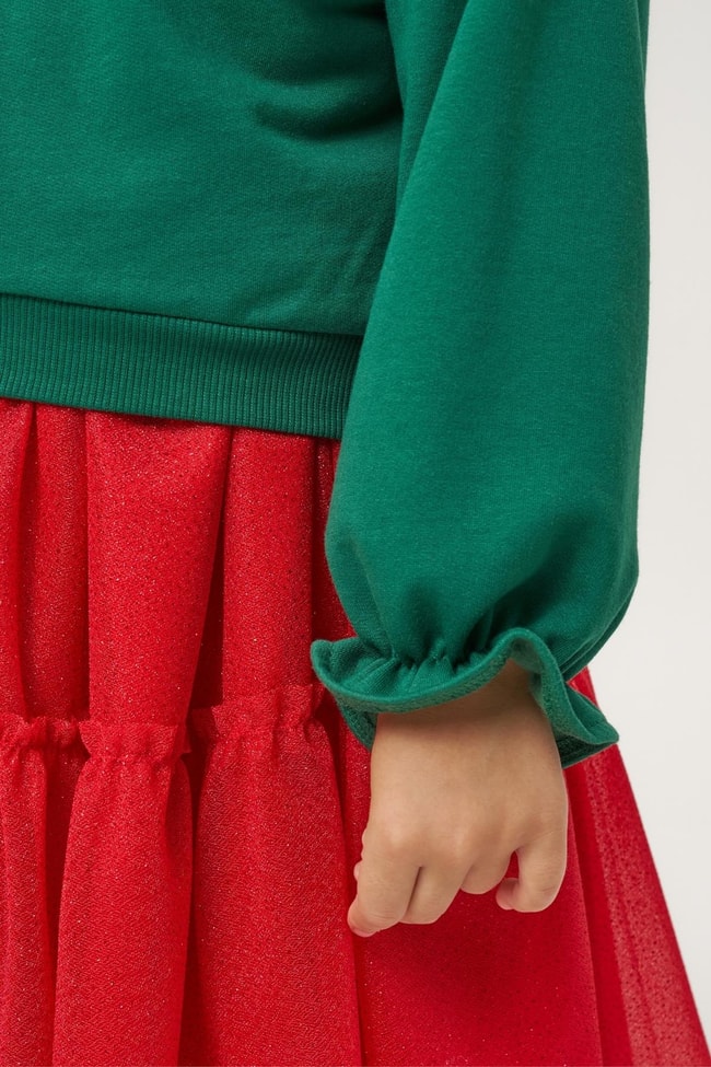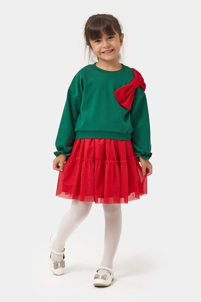 İki parçalı takım. Yumuşak pamuklu kumaştan uzun kollu yeşil sweatshirt ve kırmızı tül etekli alt parça. Omuzda kurdele detaylı, yeni yıl temalı tasarım.