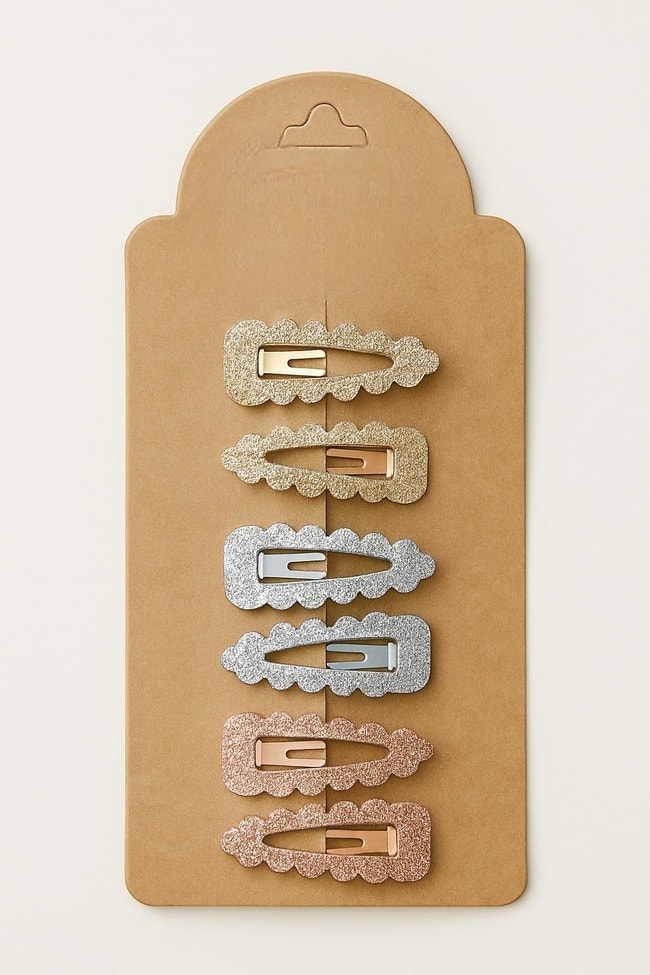 6'lı sim detaylı saç tokası seti. Altın, gümüş ve bakır tonlarında parıltılı yüzey. Pratik çıtçıt mekanizmalı.