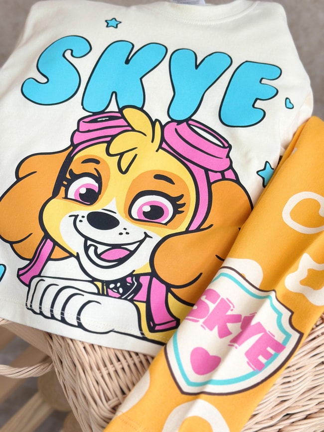 Düz yaka ve kısa kollu, Skye baskılı tişört. Esnek bel detaylı, desenli tayt.