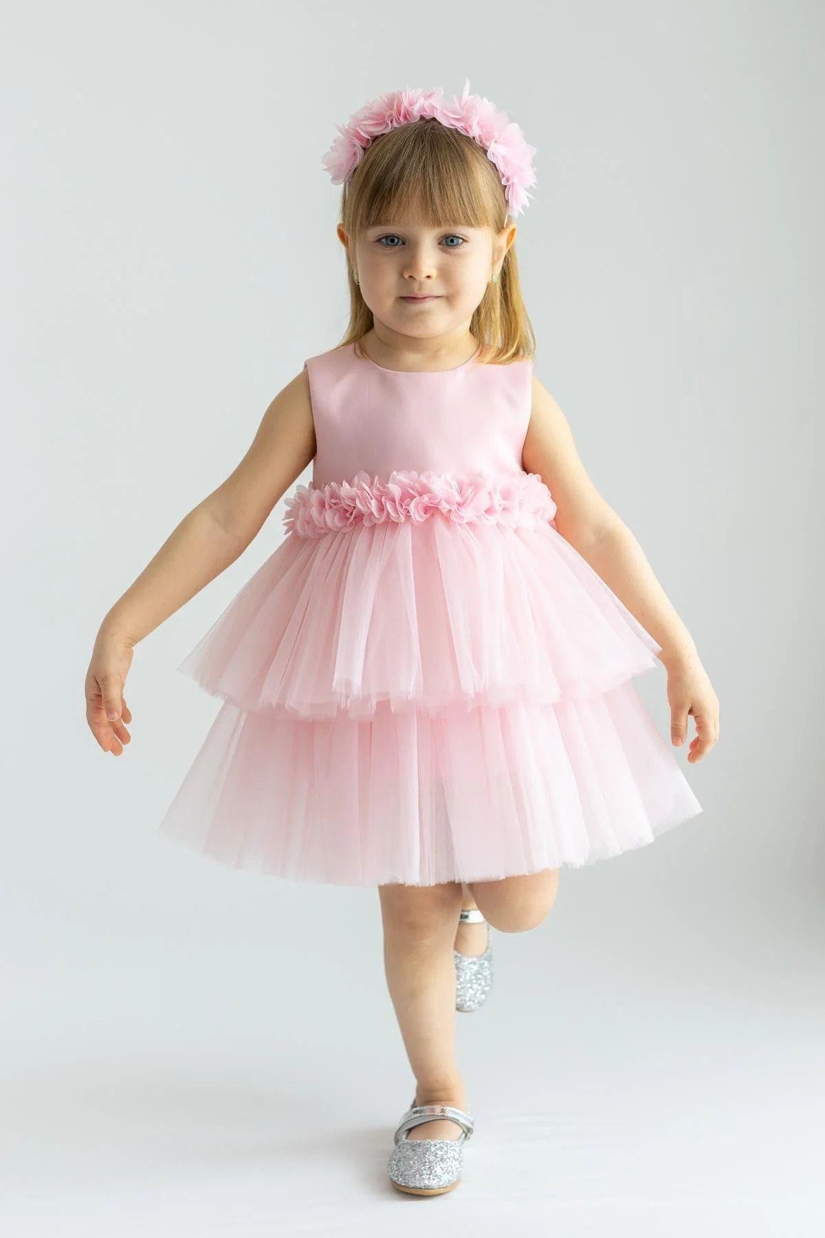 Kız Çocuk Pembe Çiçek Desenli Astarlı Pamuklu Taç Elbise